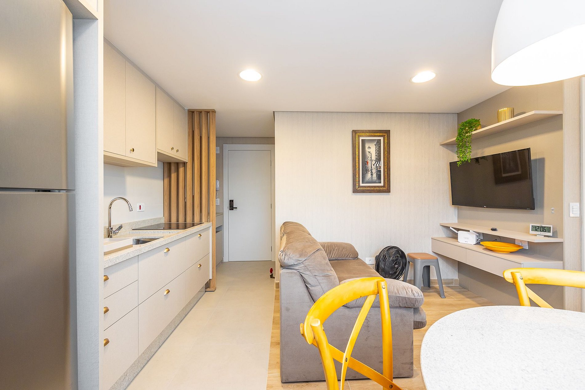 Fully furnished studio, on the 8th floor, in an excellent location in Mercês in Curitiba/PR. Finely decorated, with approximately 32m², it has: