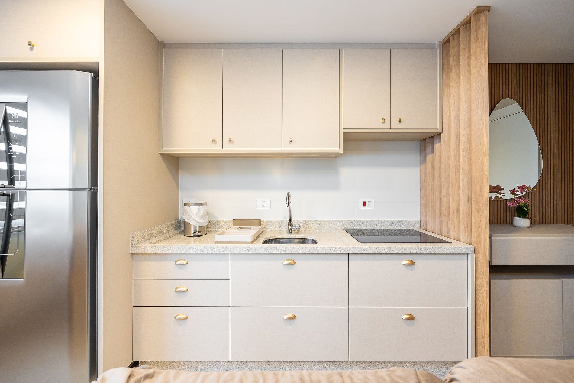 Estudio totalmente amueblado, en el 8º piso, en excelente ubicación en Mercês en Curitiba/PR. Finamente decorada, con aproximadamente 32m², cuenta con: