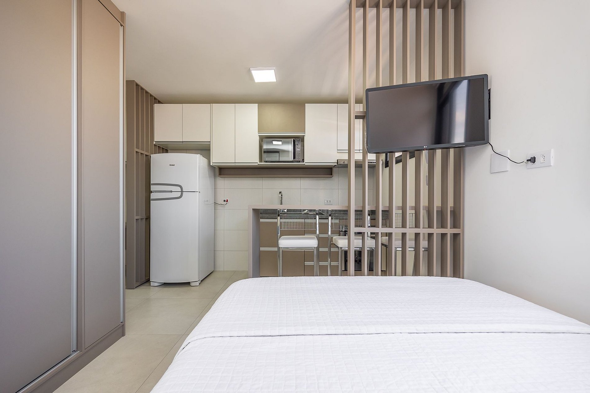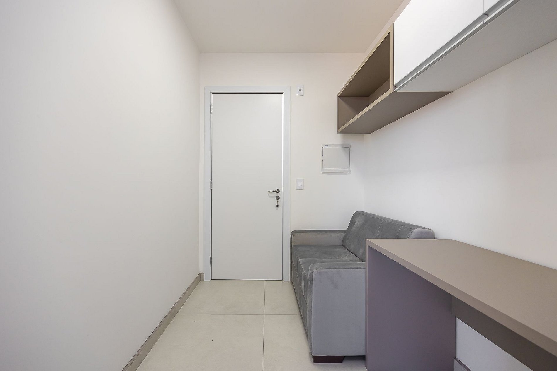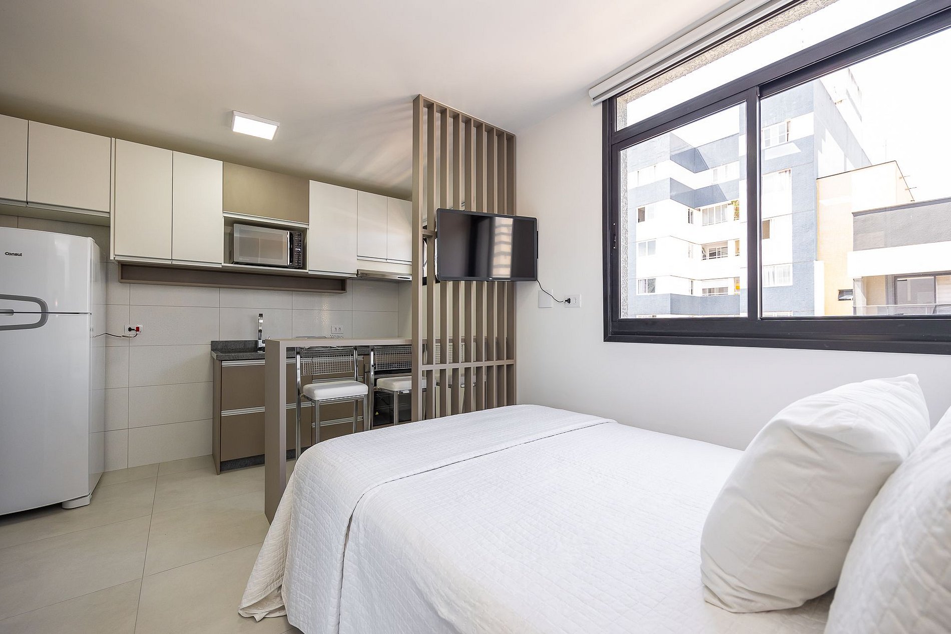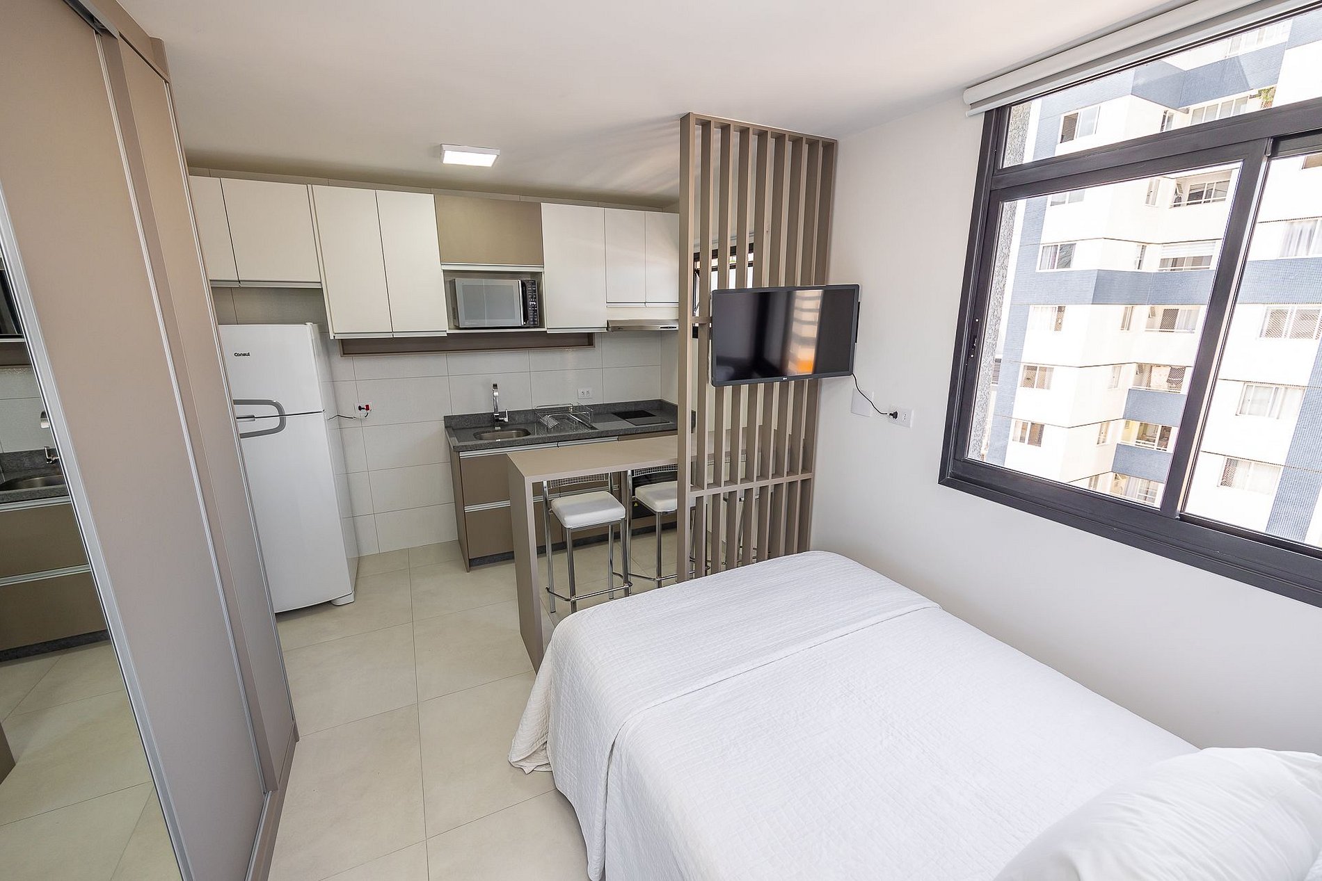 Studio totalmente mobiliado, no 10º andar, em excelente localização no centro de Curitiba/PR. Finamente decorado, com aproximadamente 26m², conta com: