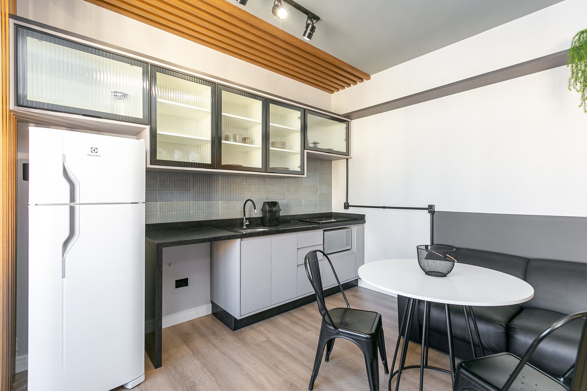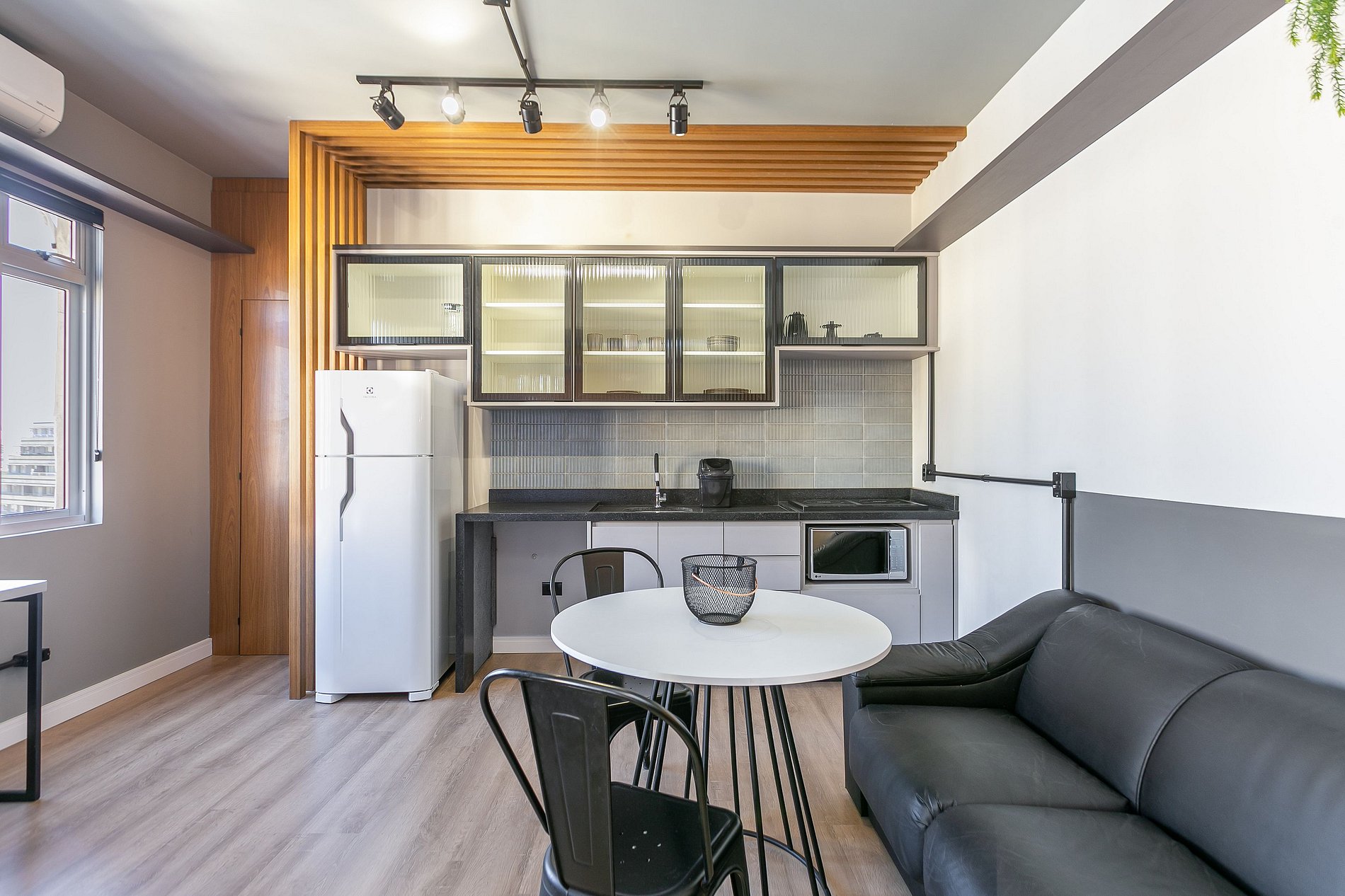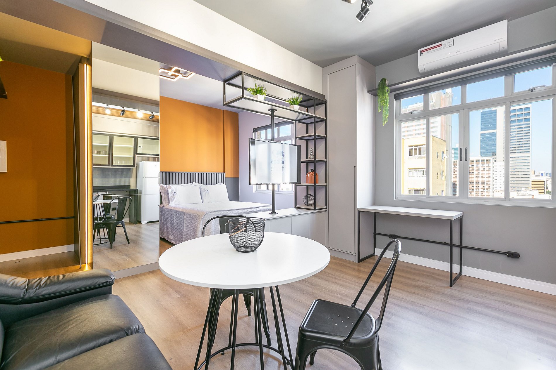 Studio totalmente mobiliado, no 17º andar, em excelente localização no centro de Curitiba/PR. Finamente decorado, com aproximadamente 35m², conta com:
