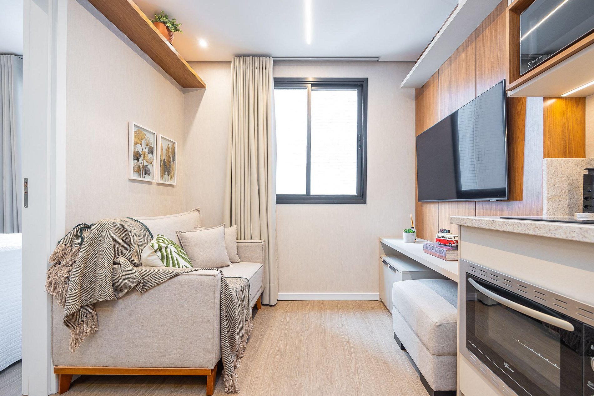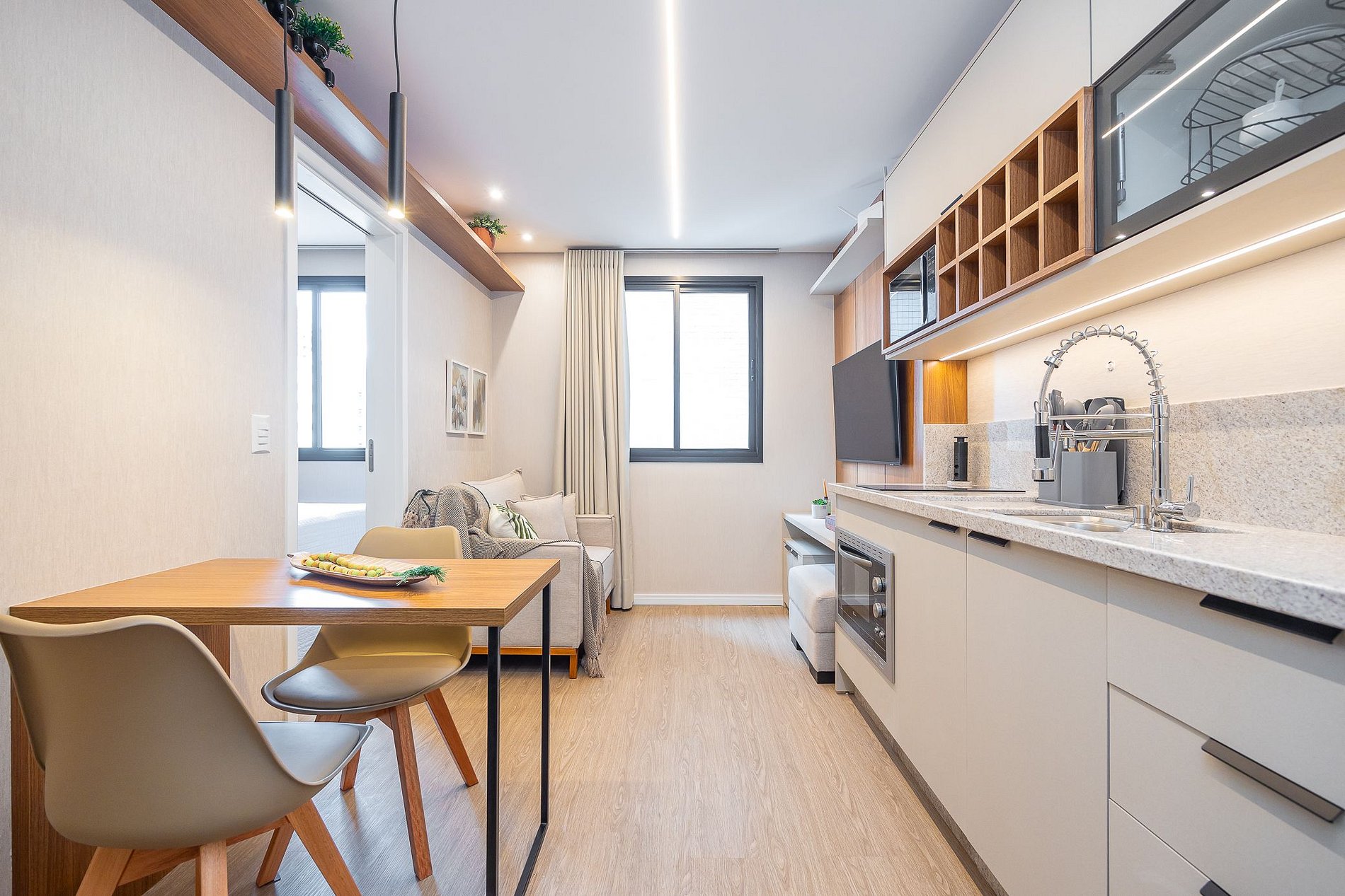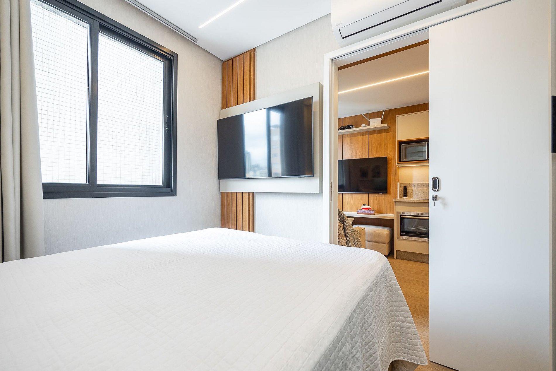 Studio totalmente mobiliado, no 10º andar, em excelente localização no centro de Curitiba/PR. Finamente decorado, com aproximadamente 30m², conta com: