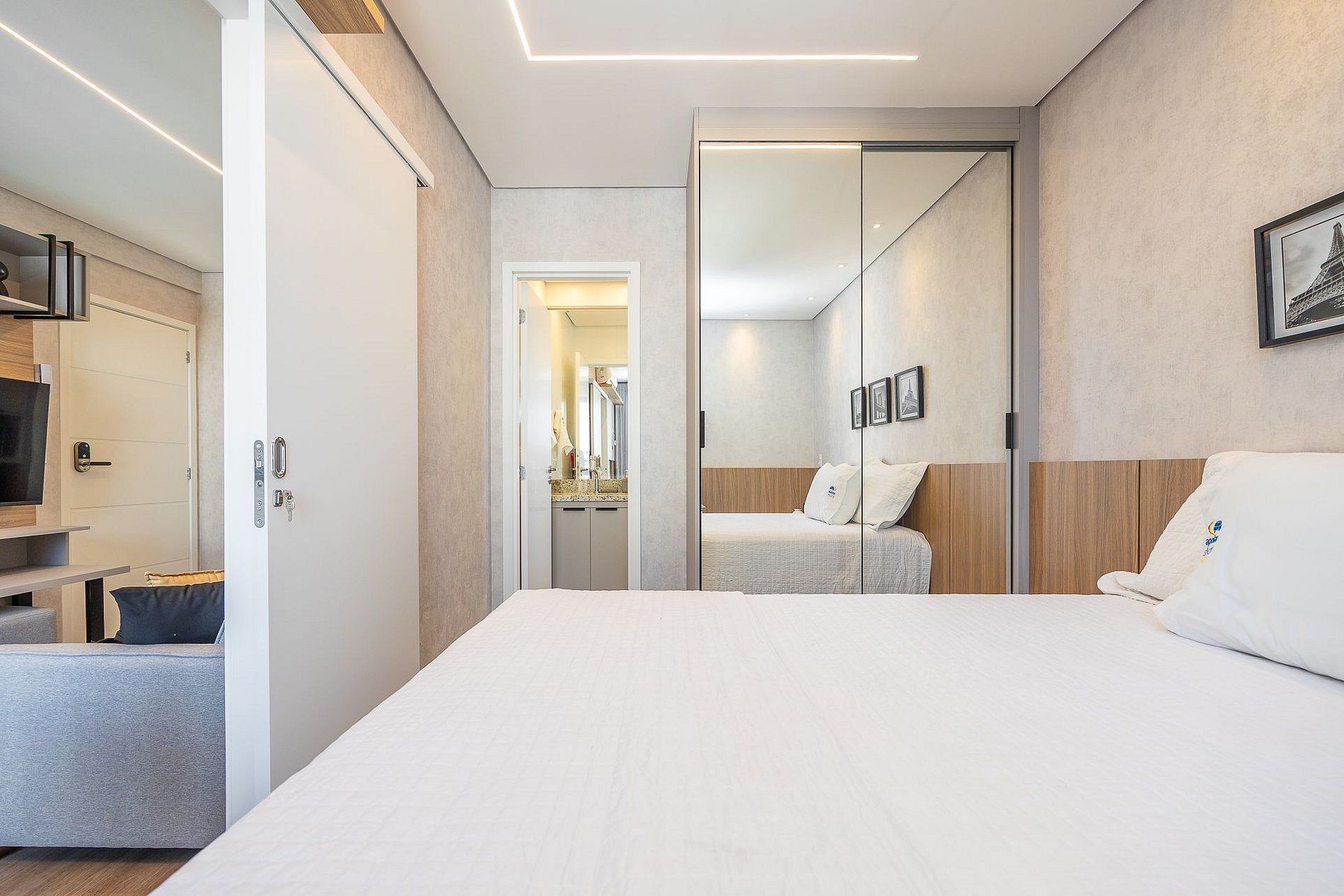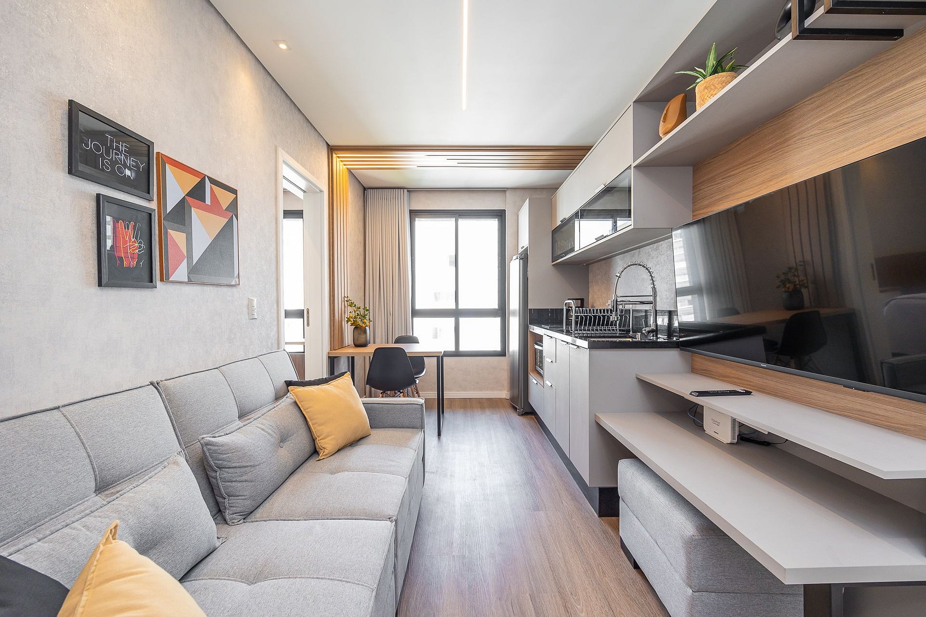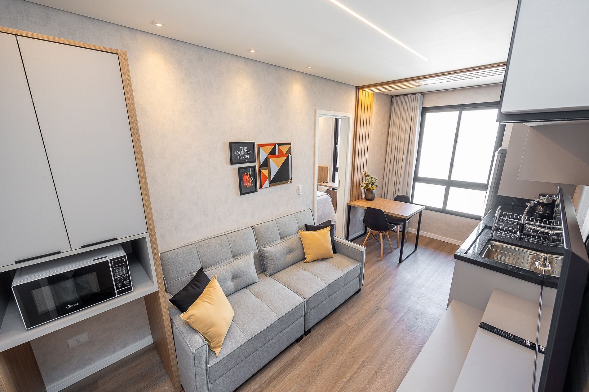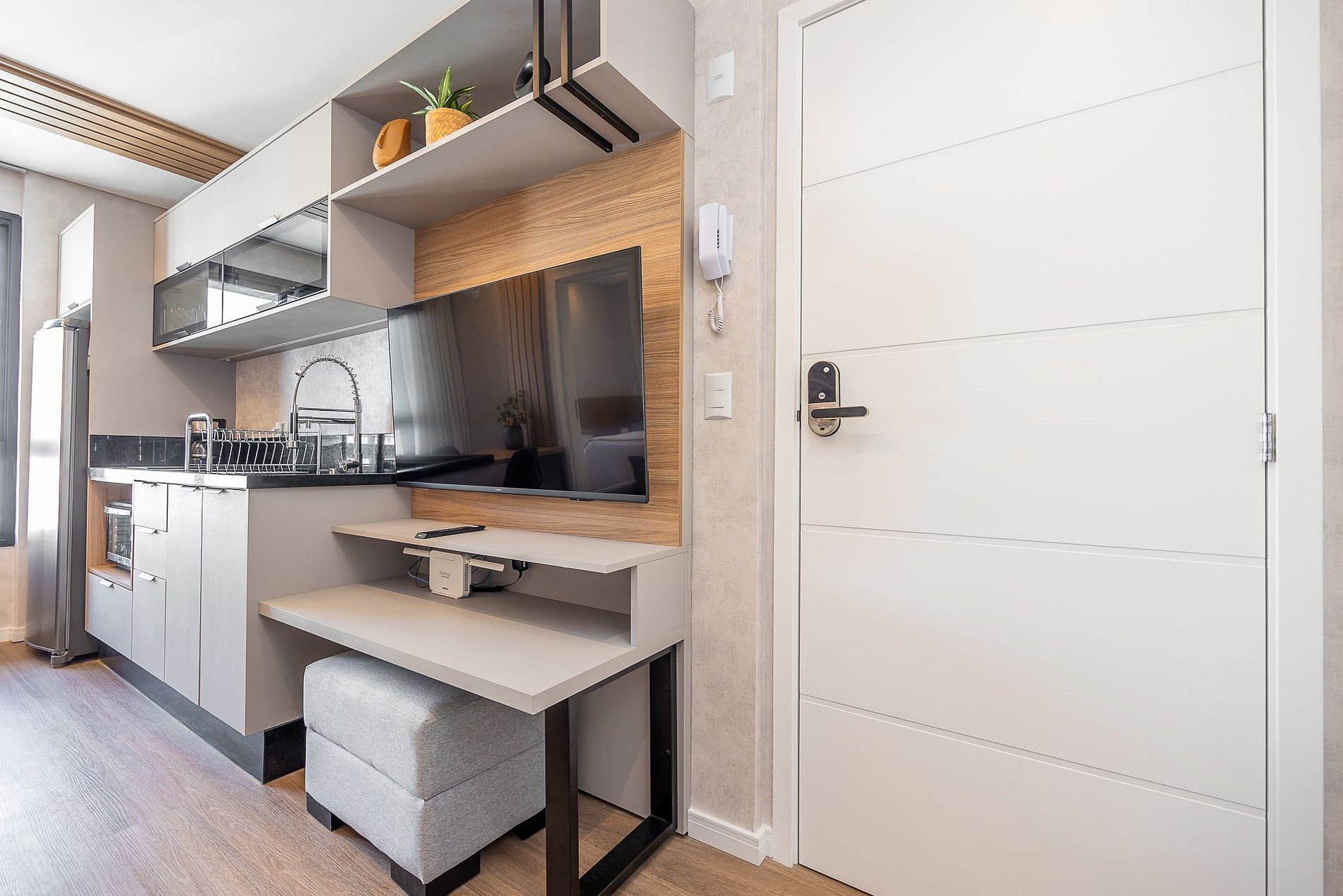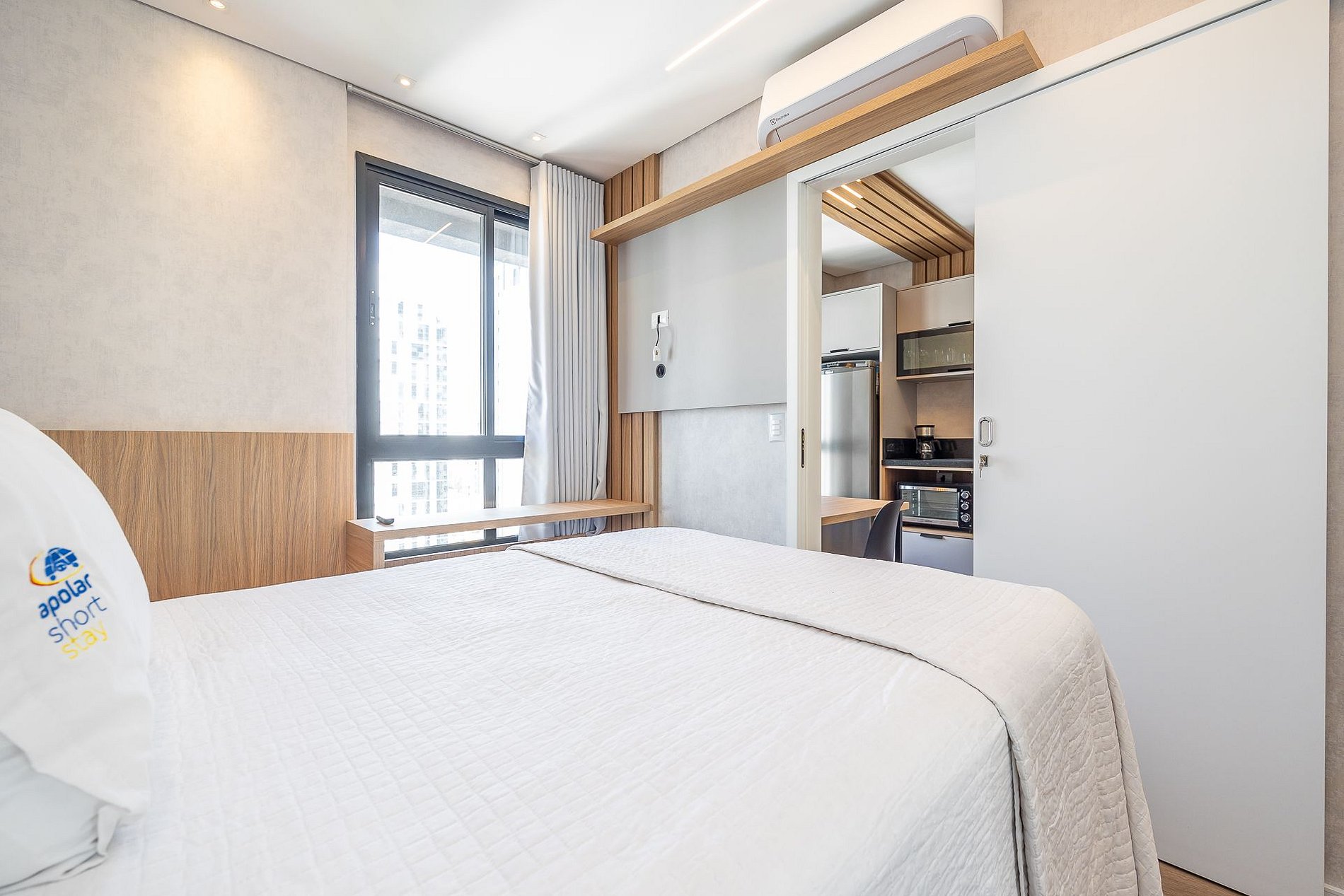 Wi-Fi incluído, Aquecimento a gás, Móveis sob medida, Cama box casal, Smart TV, Cadeiras, Geladeira, Fogão de indução, ,Jogo de panelas, Talheres, Jogo de facas,Louças, Utensílios para cozinha.
