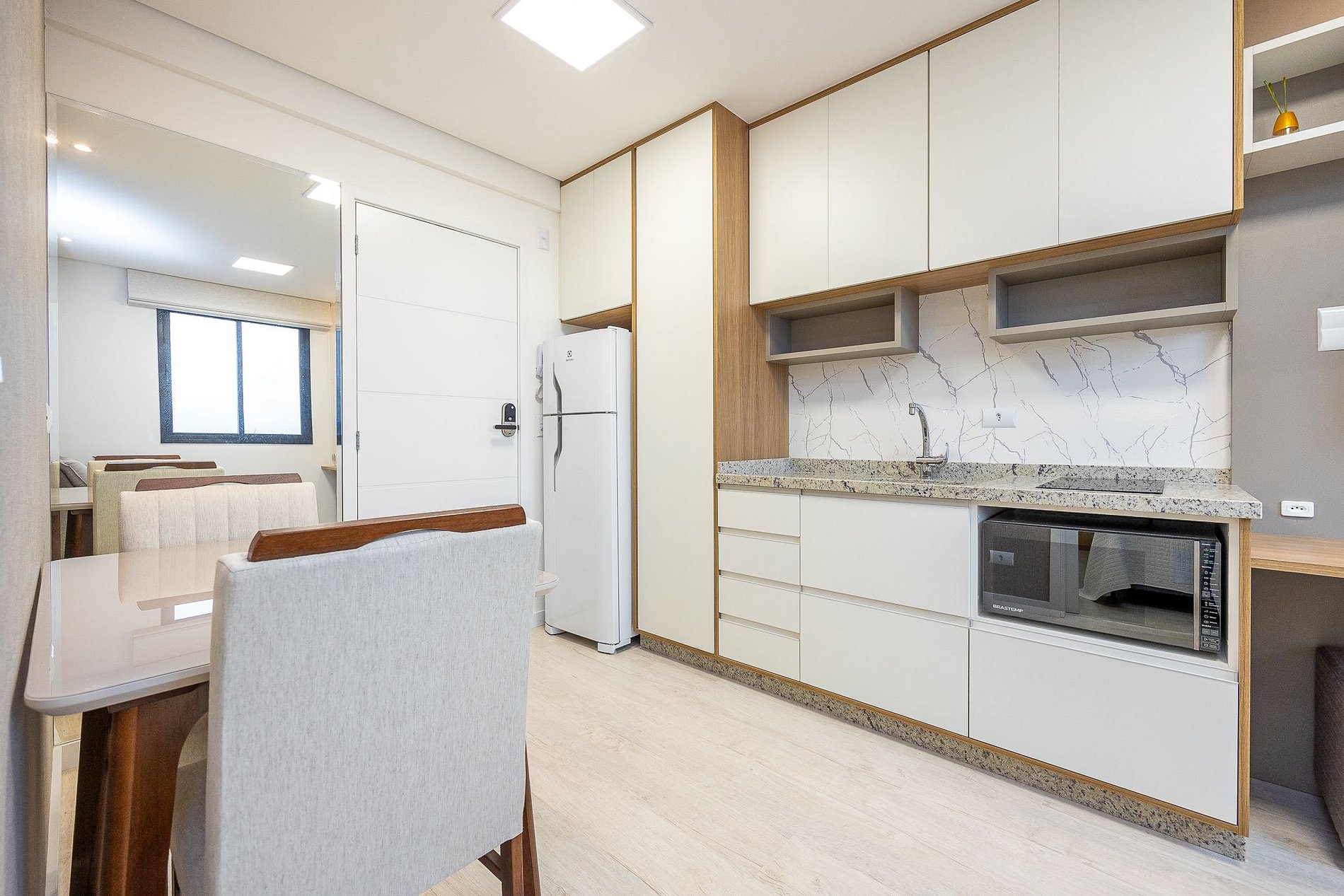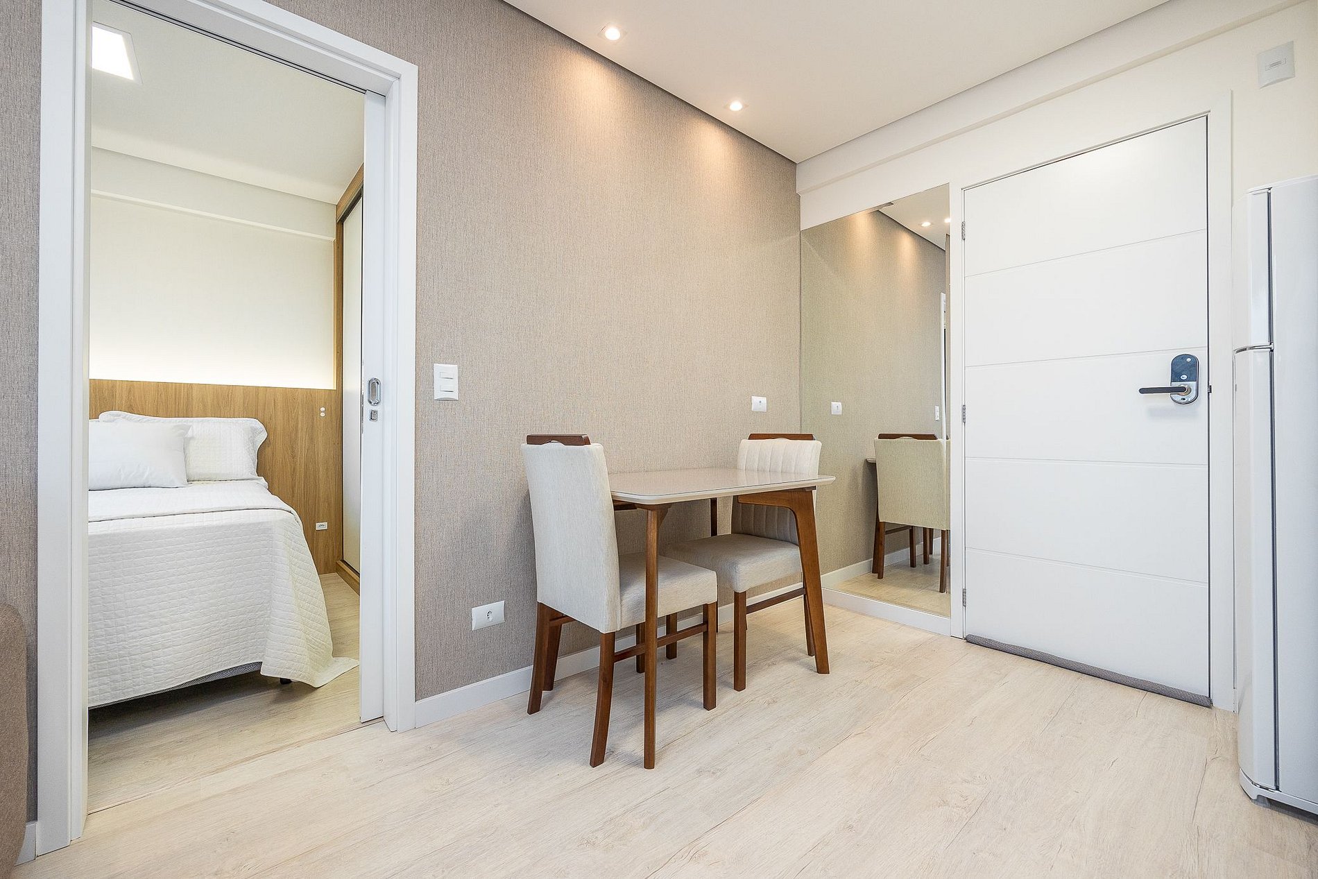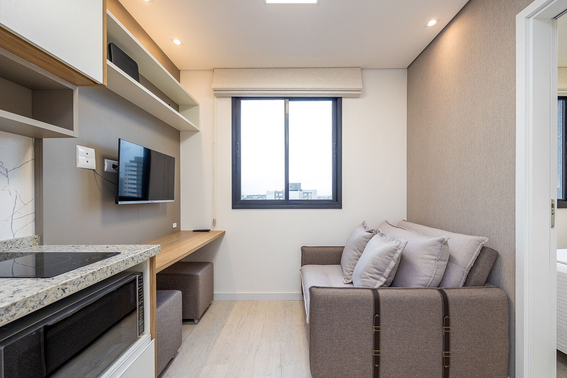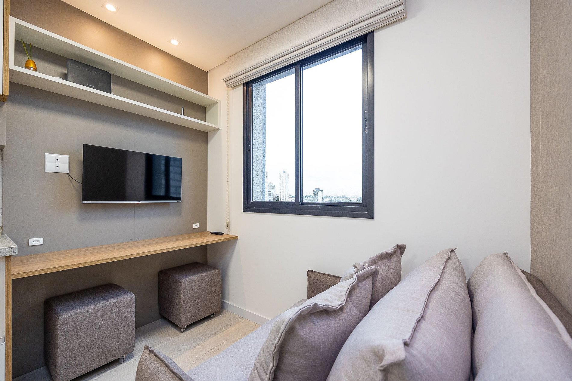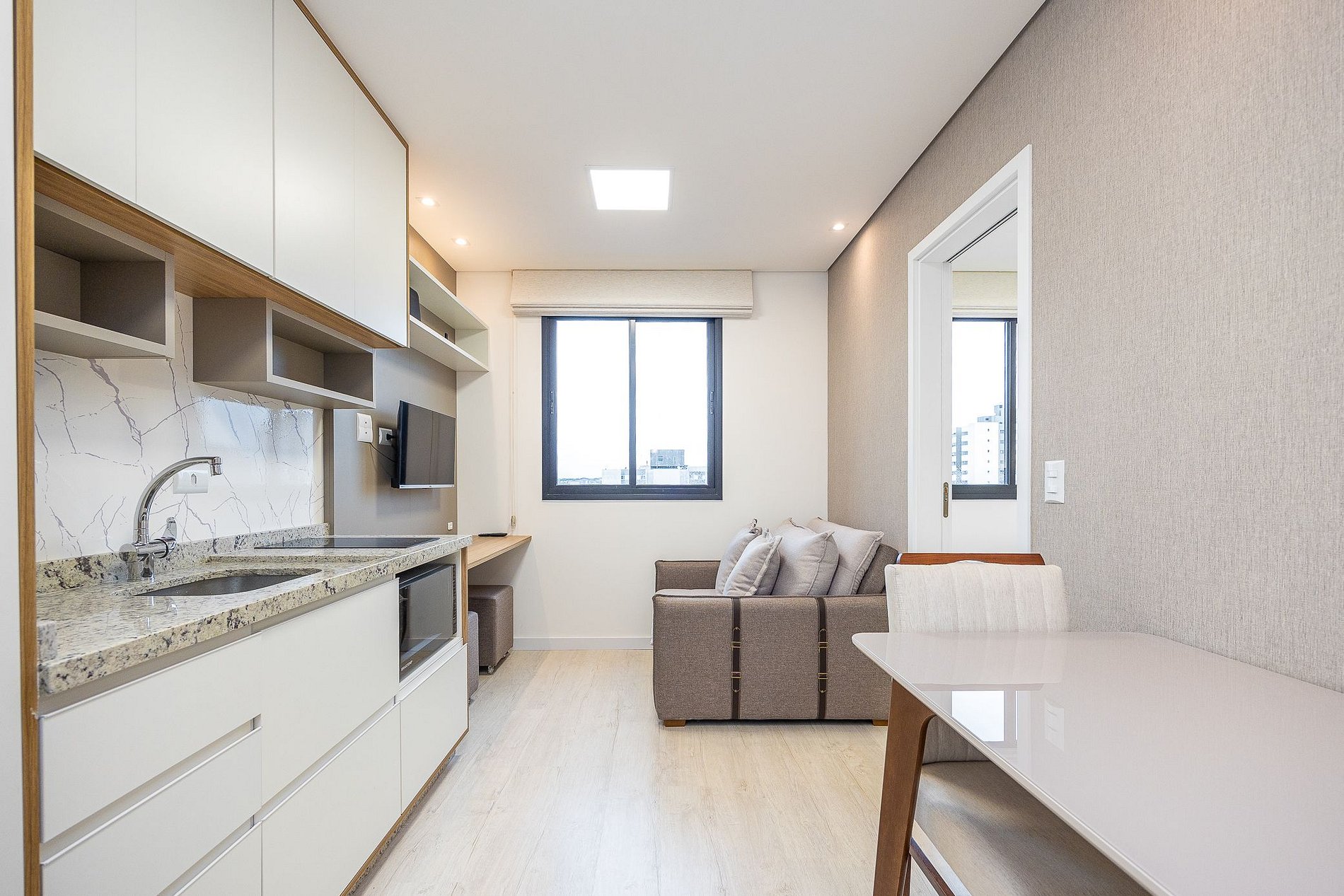 Studio totalmente mobiliado, no 11º andar, em excelente localização no centro de Curitiba/PR. Finamente decorado, com aproximadamente 30m², conta com: