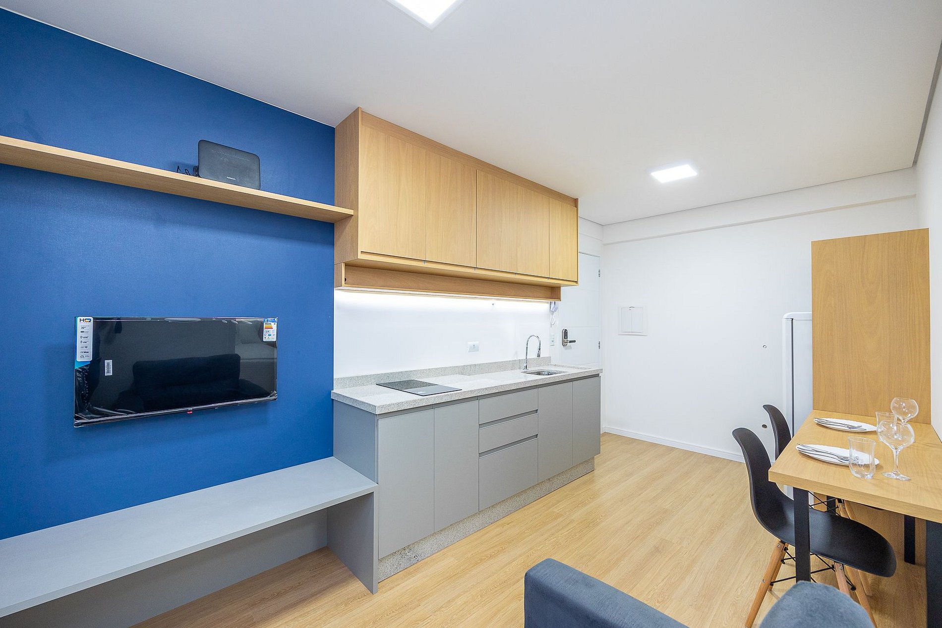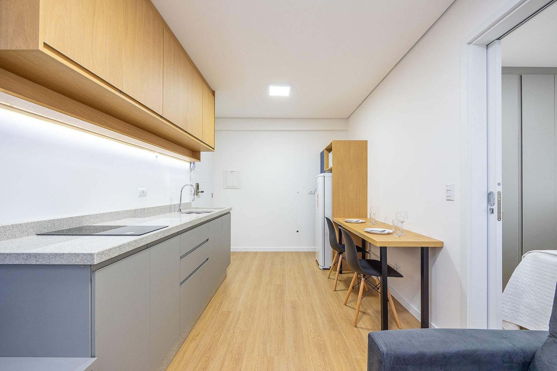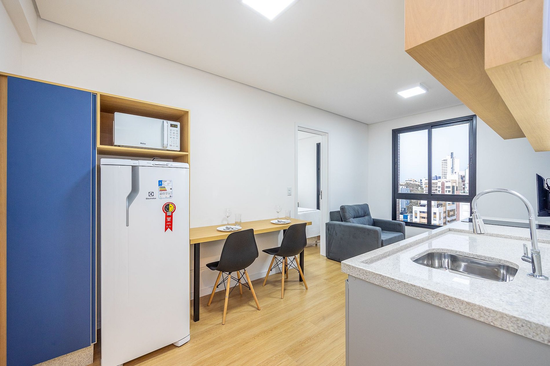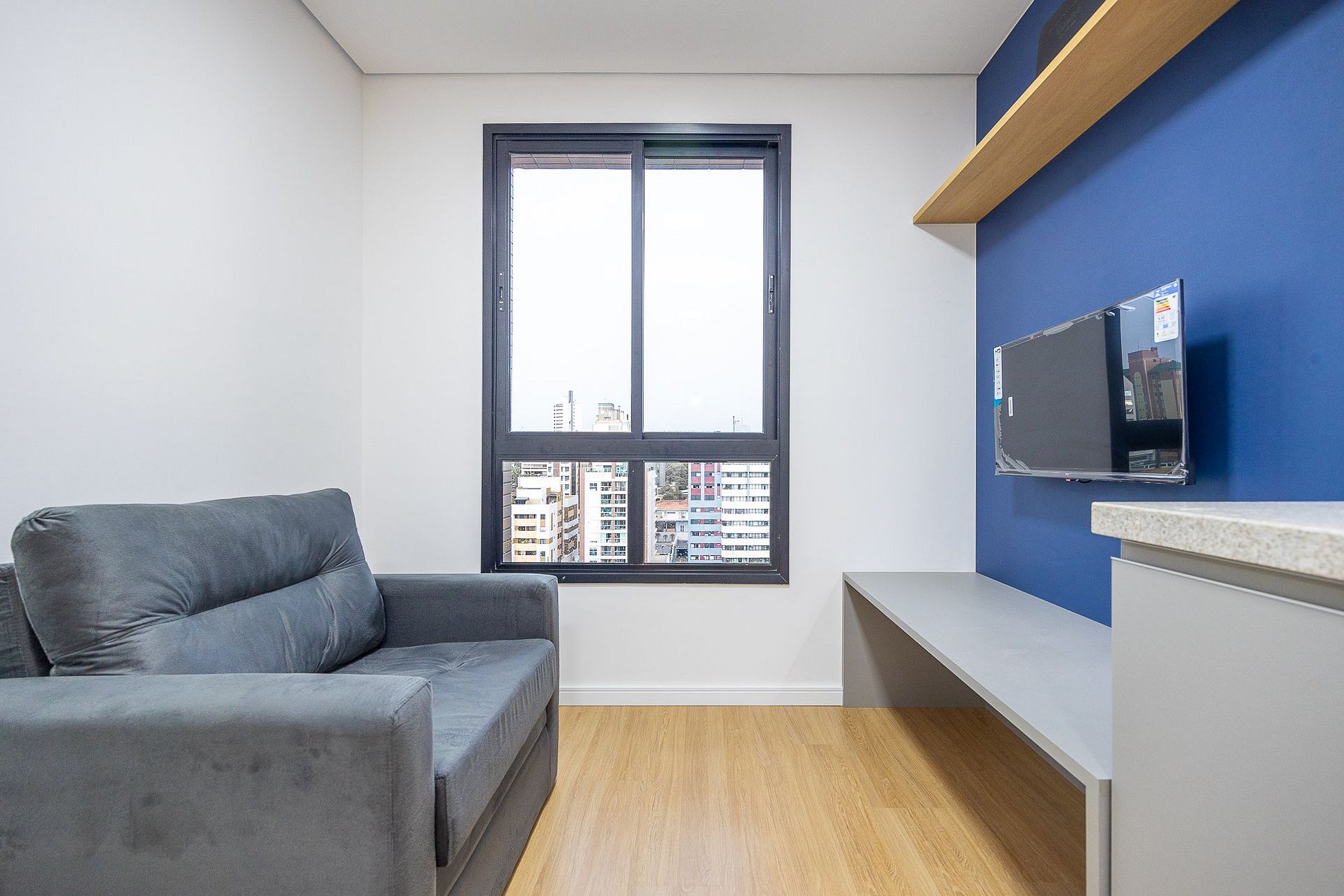 Studio totalmente mobiliado, no 12º andar, em excelente localização no centro de Curitiba/PR. Finamente decorado, com aproximadamente 30m², conta com: