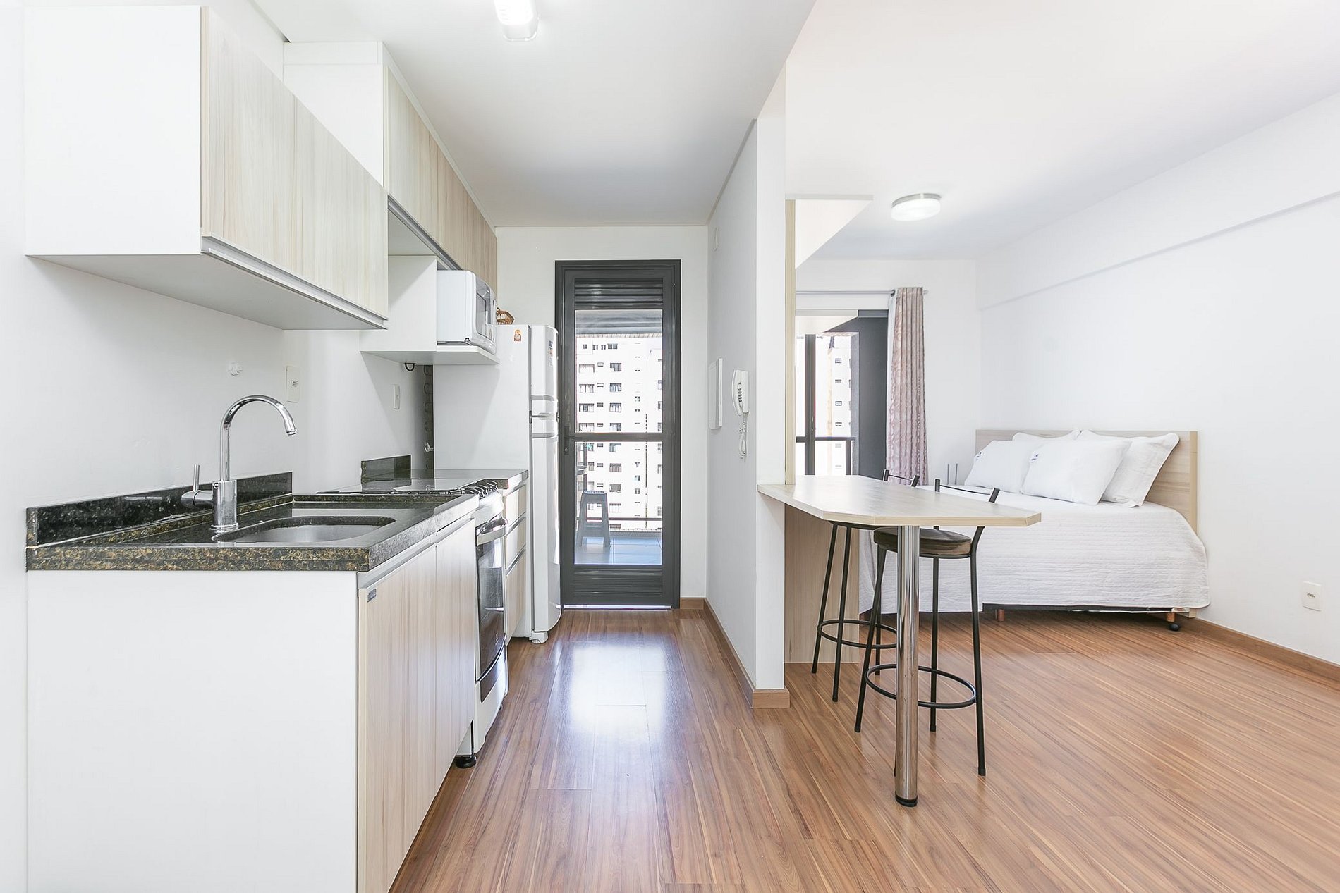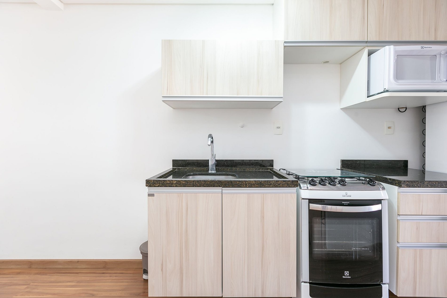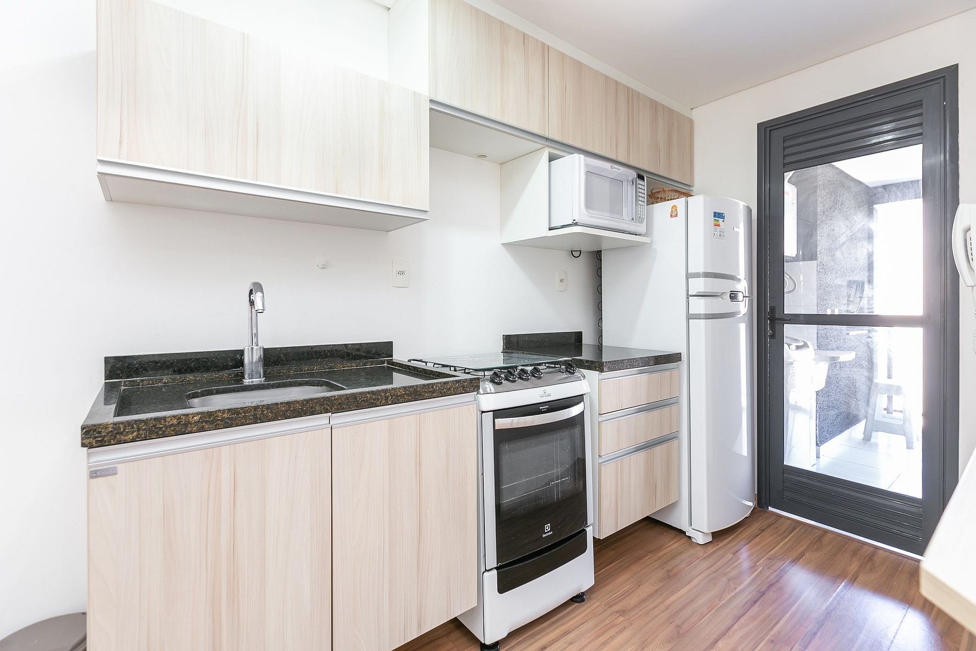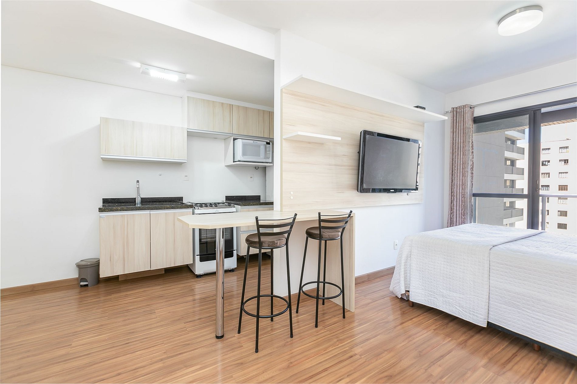 Studio, totalmente mobiliado, no 12º andar, em excelente localização no bairro Bigorrilho, em Curitiba/PR. Decorado, com aproximadamente 25m², conta com: Sacada com churrasqueira, Wi-Fi de alta velocidade, Aquecimento a gás. Cama de casal, roupeiro e mesa de cabeceira. Cozinha completa, com geladeira duplex, fogão a gás, microondas e todos os utensílios. Lavanderia com máquina de lavar, tanque e varal portátil. *Roupas de cama, mesa e banho não estão incluídas.