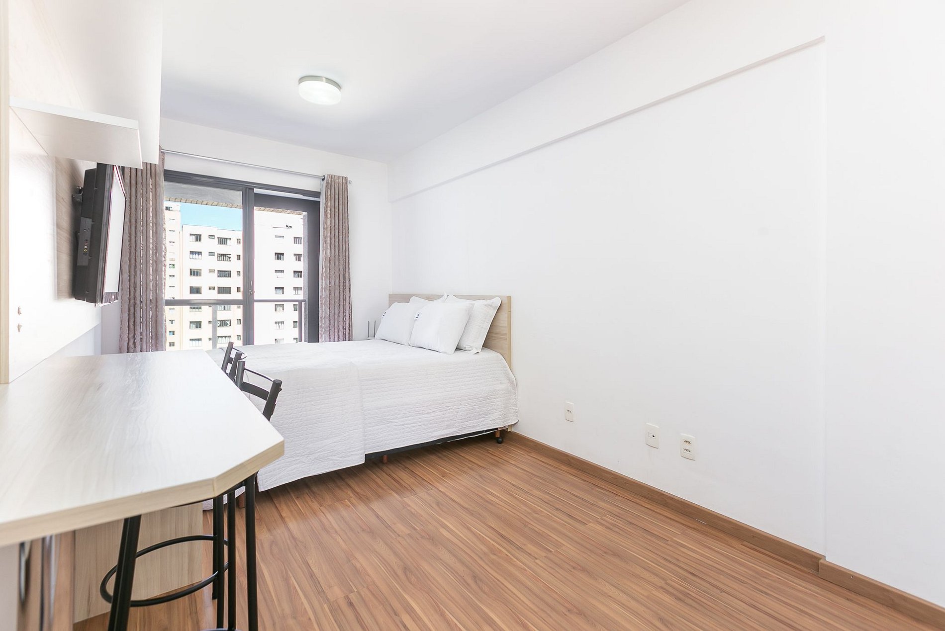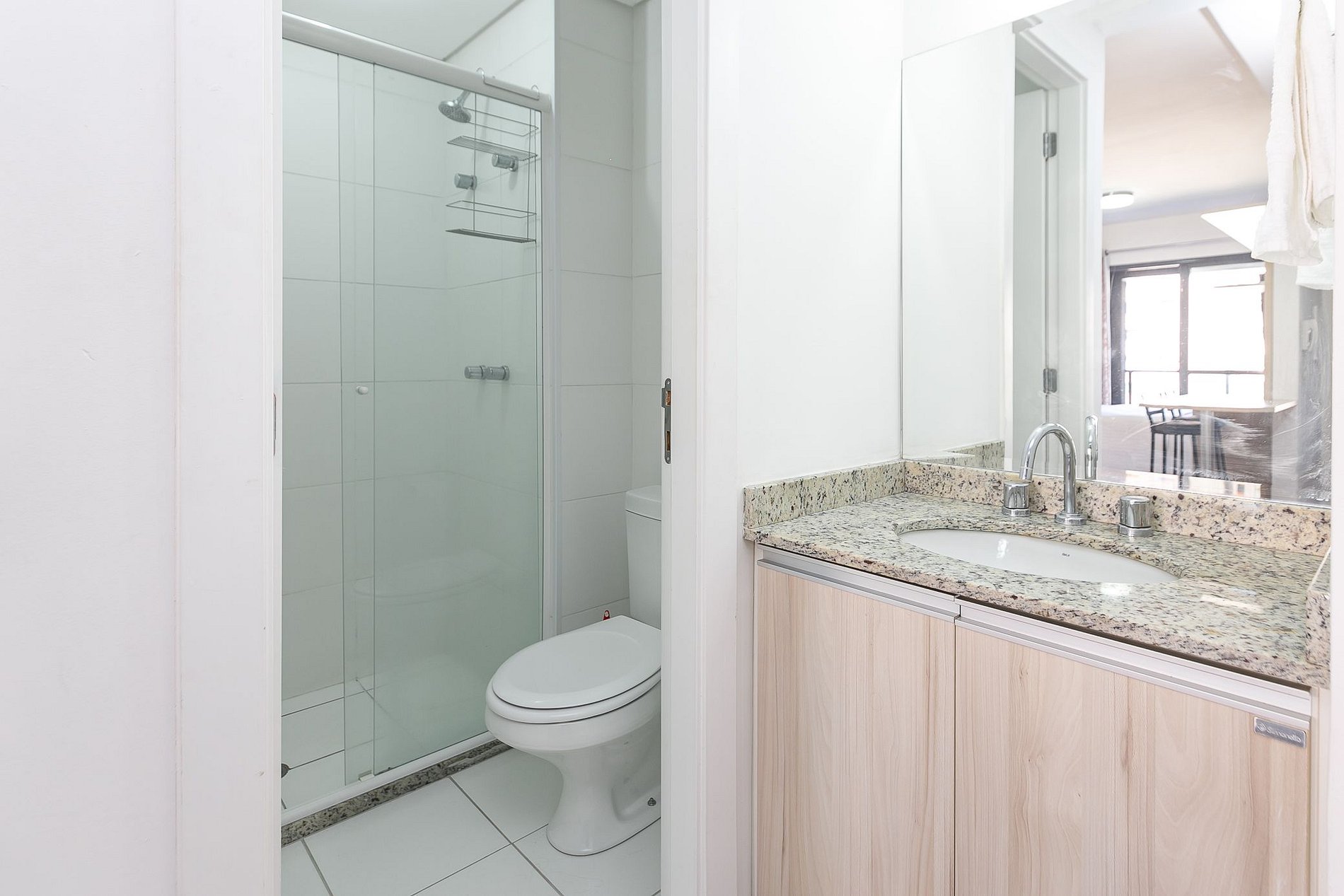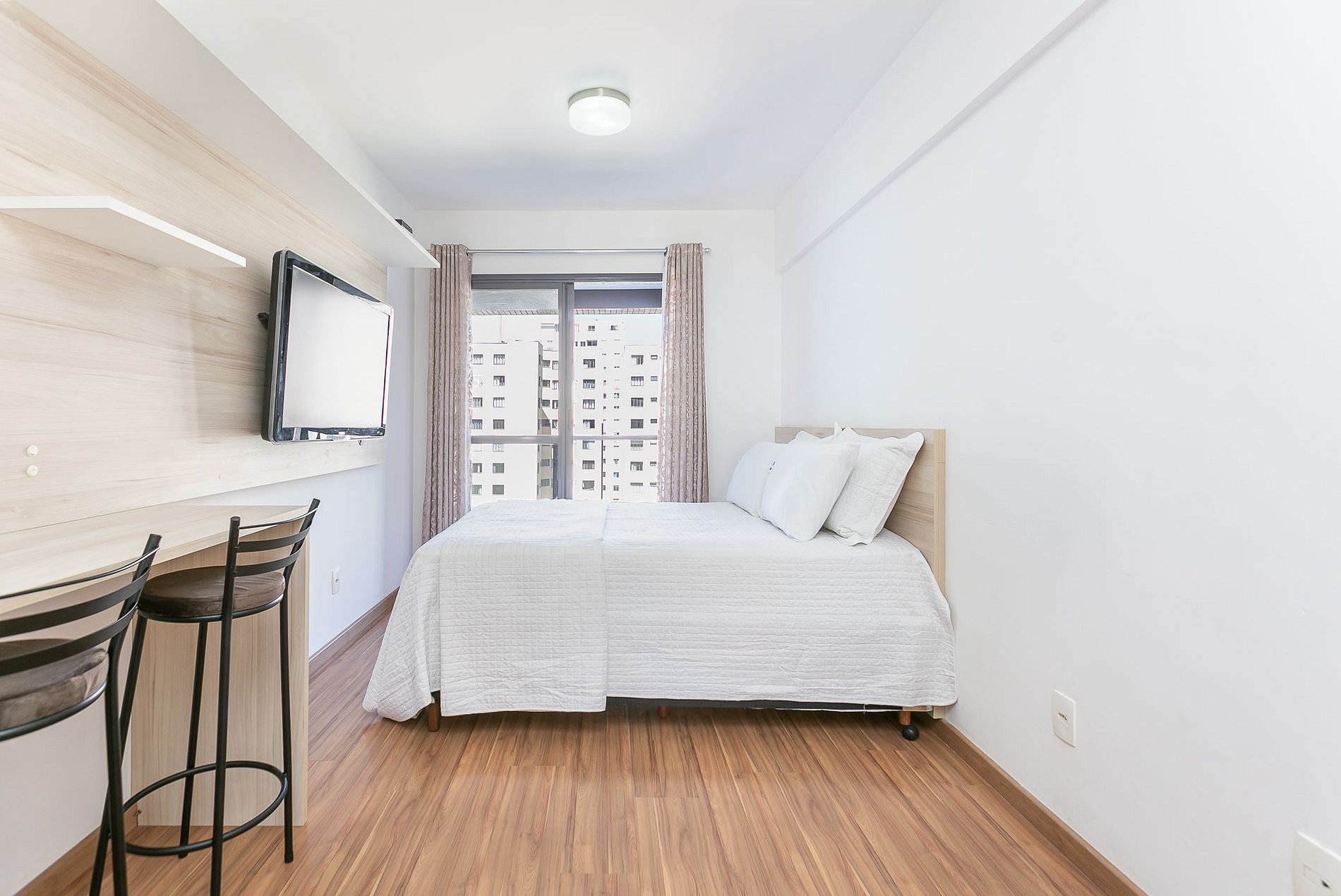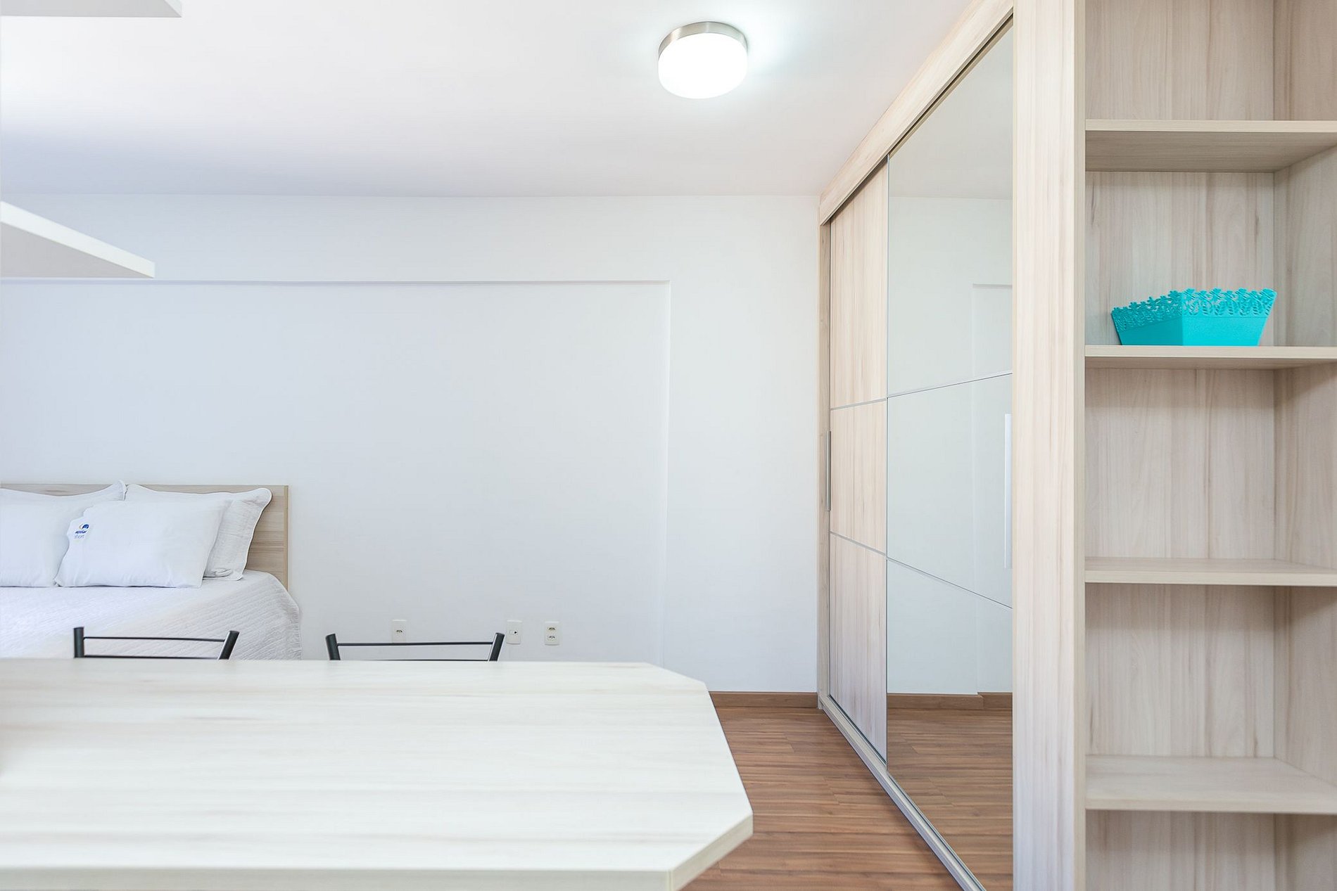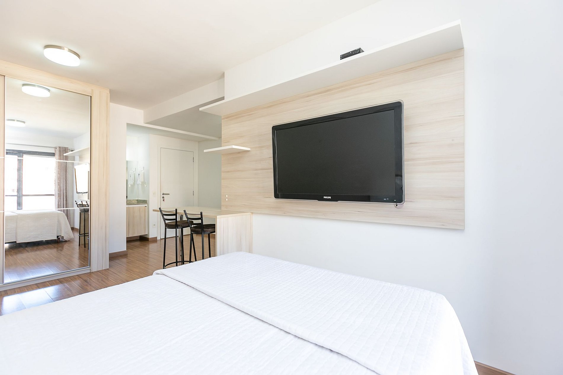 Studio, totalmente mobiliado, no 12º andar, em excelente localização no bairro Bigorrilho, em Curitiba/PR. Decorado, com aproximadamente 25m², conta com: Sacada com churrasqueira, Wi-Fi de alta velocidade, Aquecimento a gás. Cama de casal, roupeiro e mesa de cabeceira. Cozinha completa, com geladeira duplex, fogão a gás, microondas e todos os utensílios. Lavanderia com máquina de lavar, tanque e varal portátil. *Roupas de cama, mesa e banho não estão incluídas.