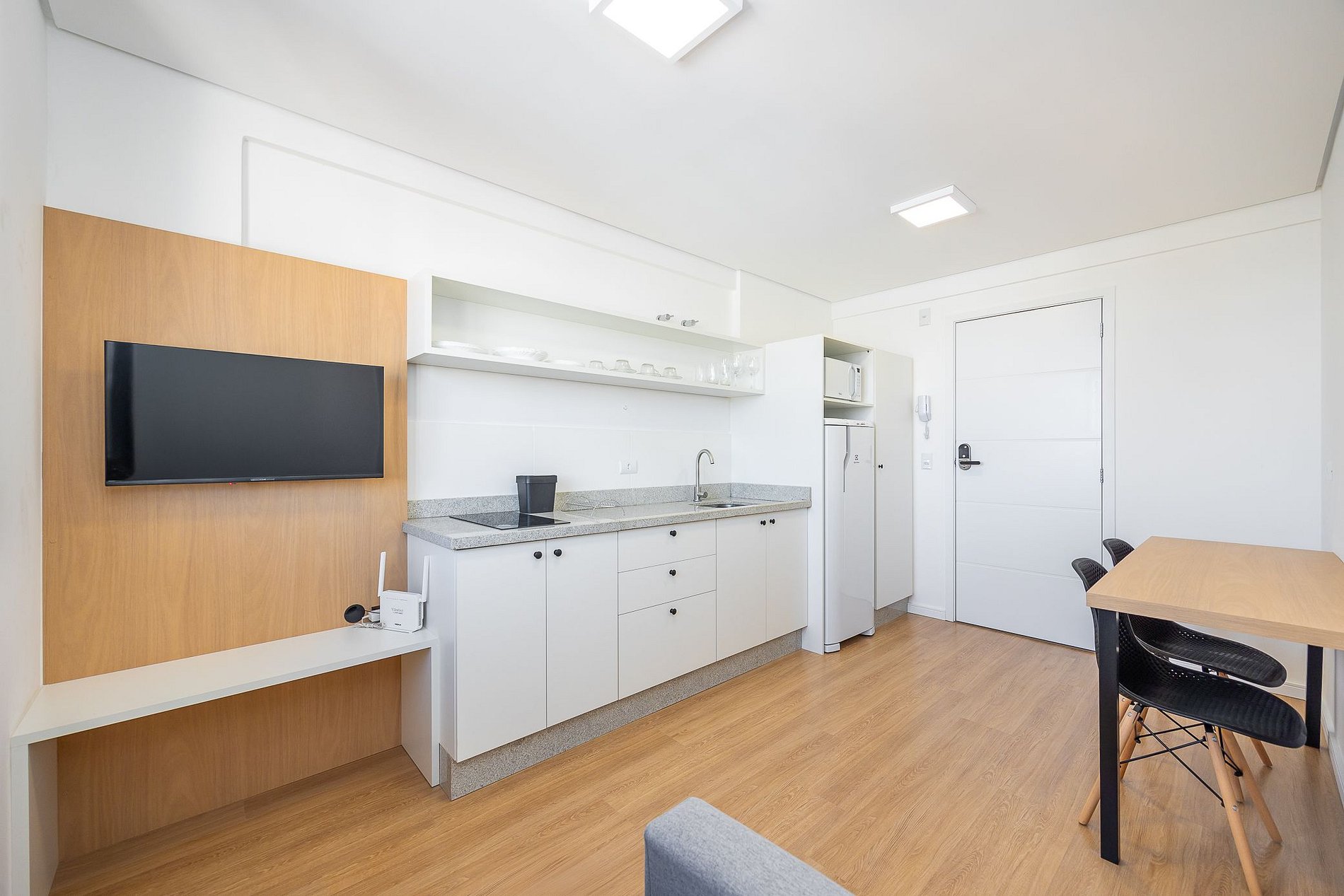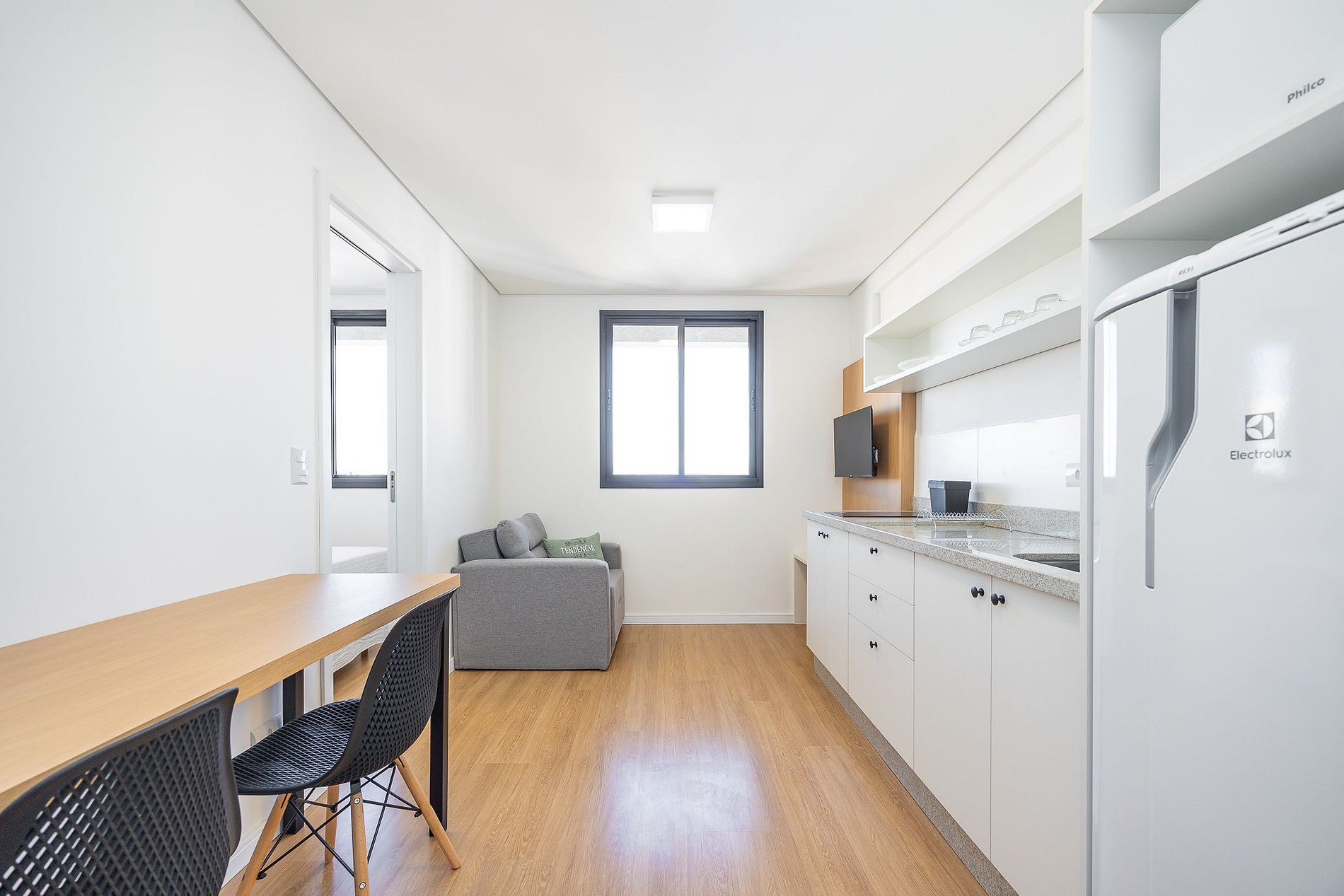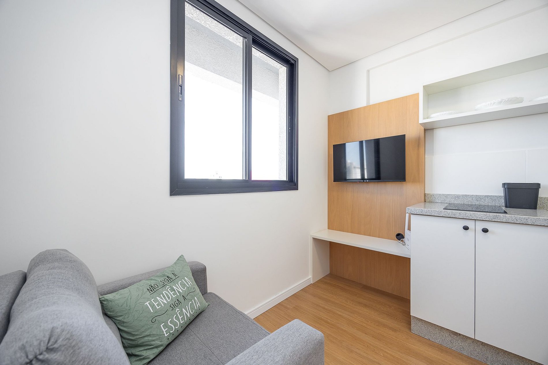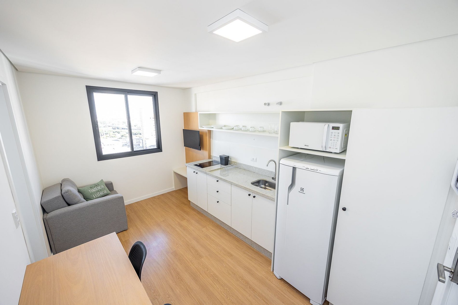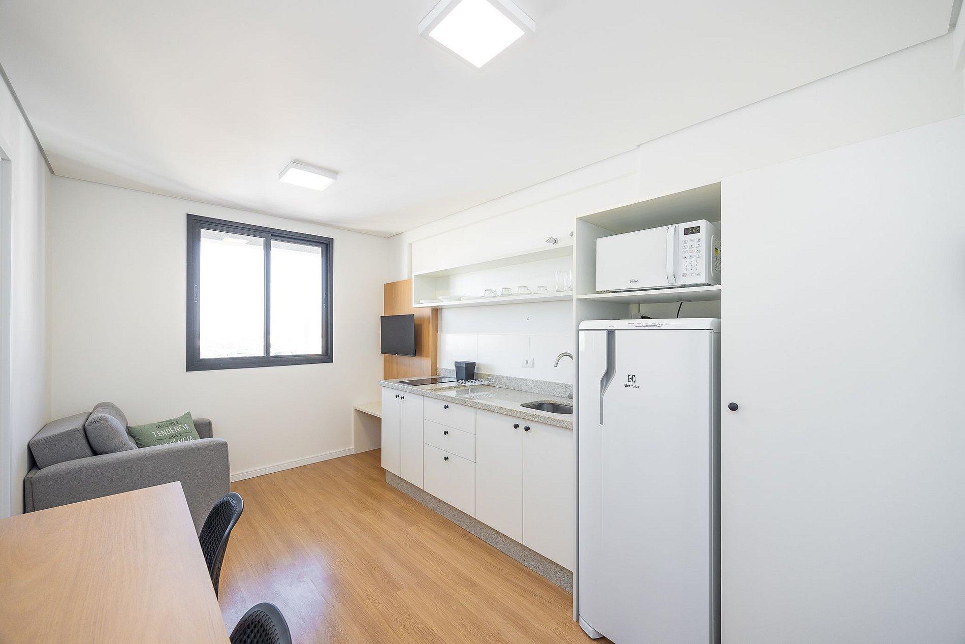 Studio totalmente mobiliado, no 4º andar, em excelente localização no centro de Curitiba/PR. Finamente decorado, com aproximadamente 30m², conta com: Wi-Fi incluído, Aquecimento elétrico, Móveis sob medida, Cama box casal, Smart TV, banquetas, frigobar, Fogão de elétrico de 2 bocas, microondas, Jogo de panelas, Talheres, Jogo de facas,Louças, Utensílios para cozinha. *Roupas de cama, mesa e banho não estão incluídas.