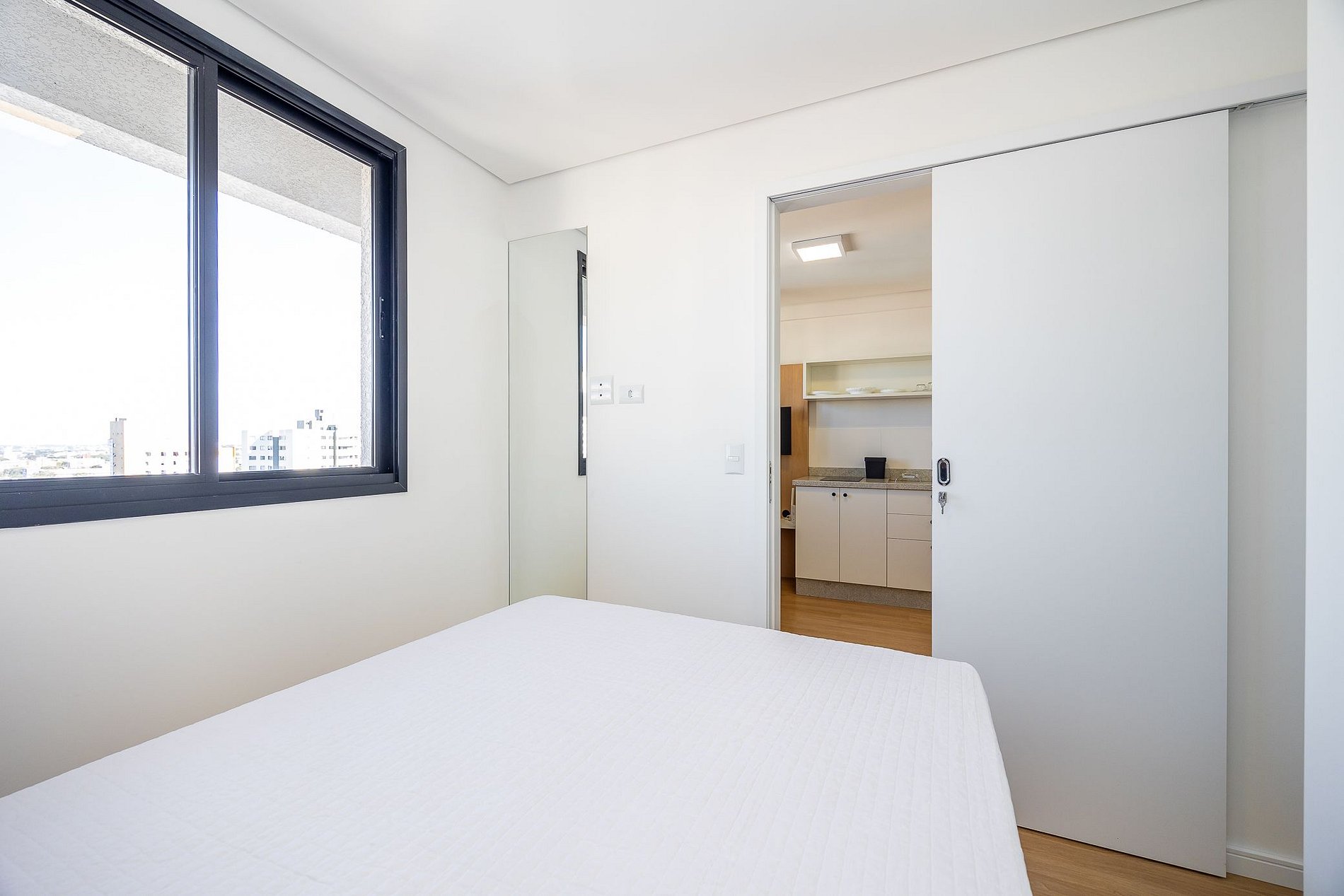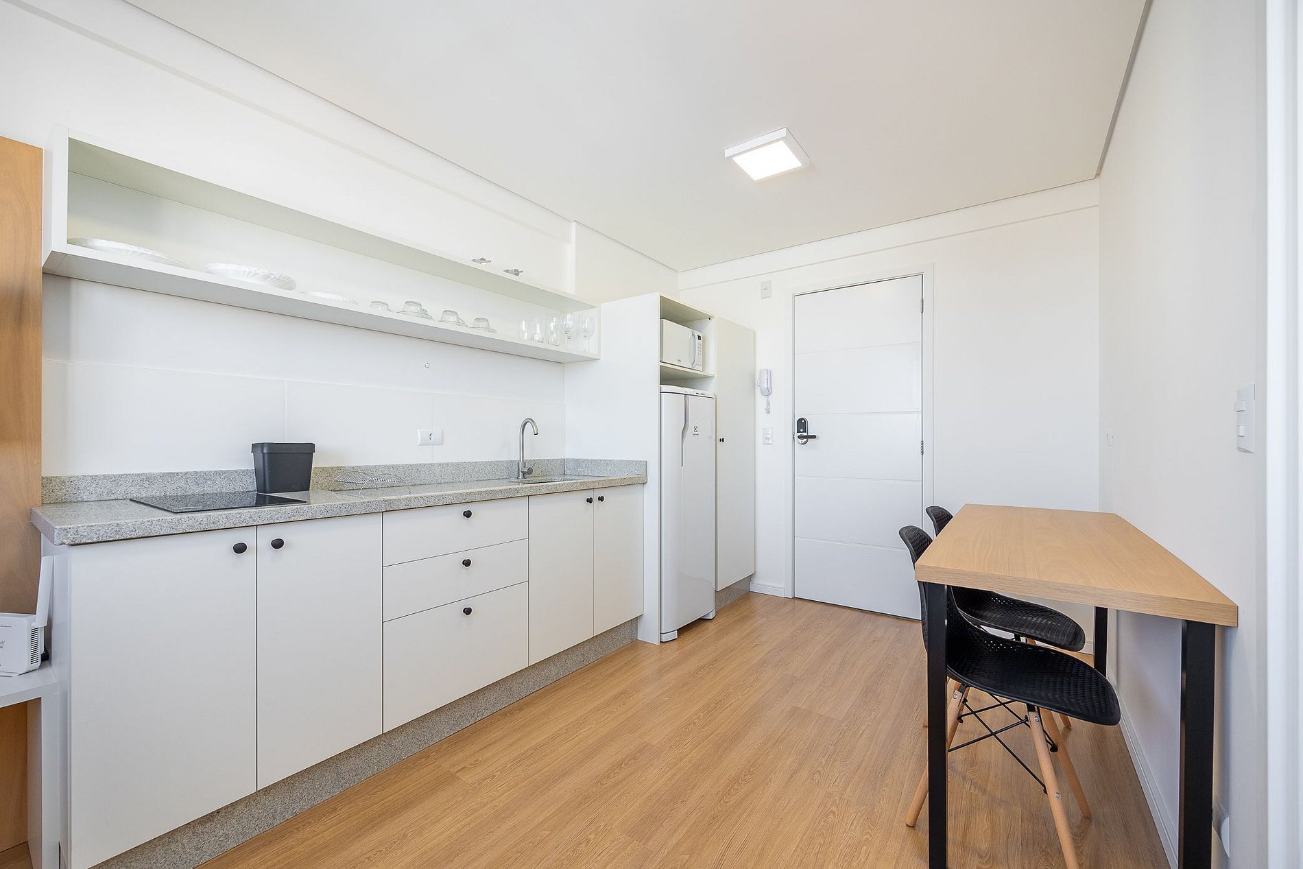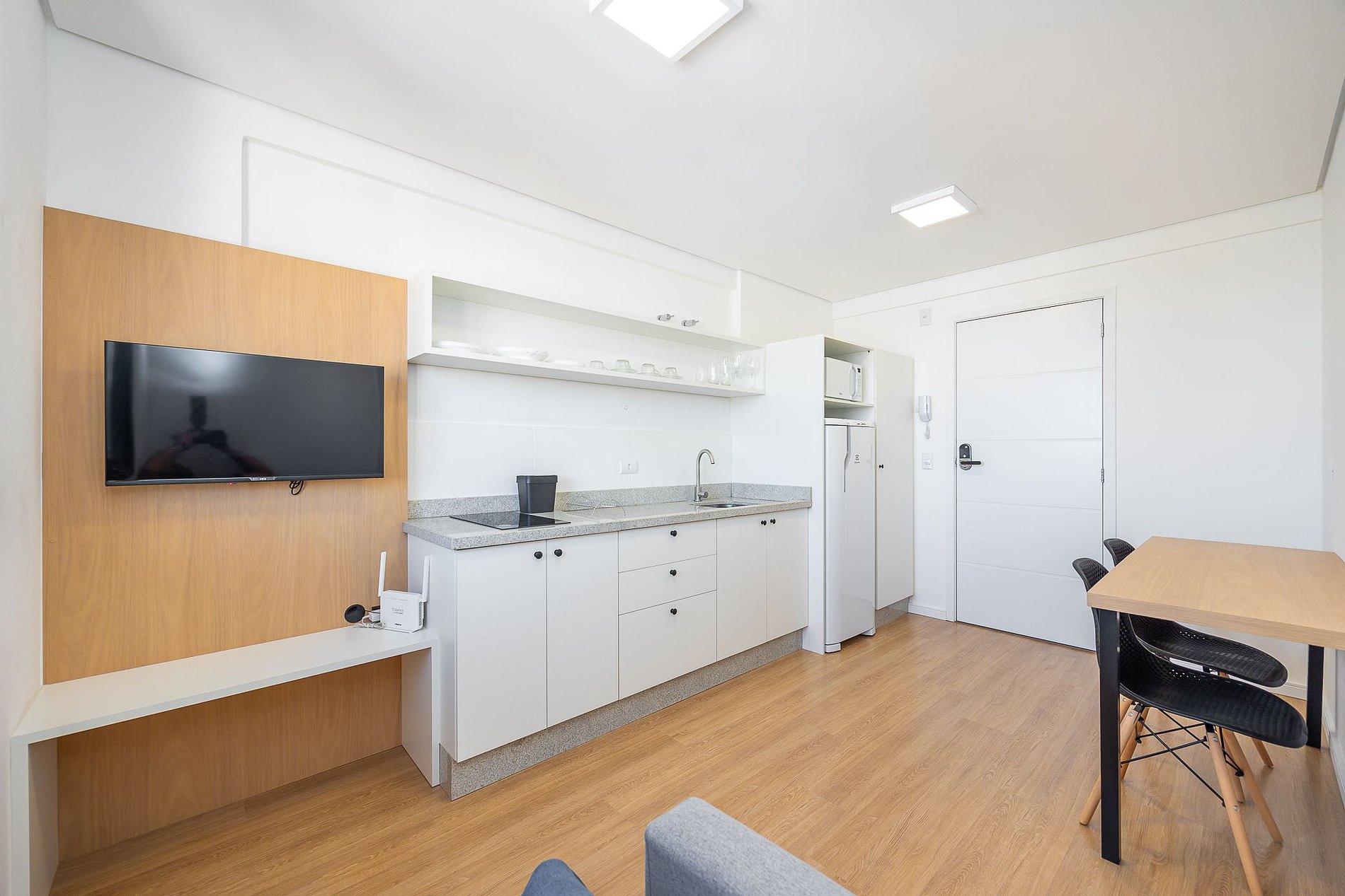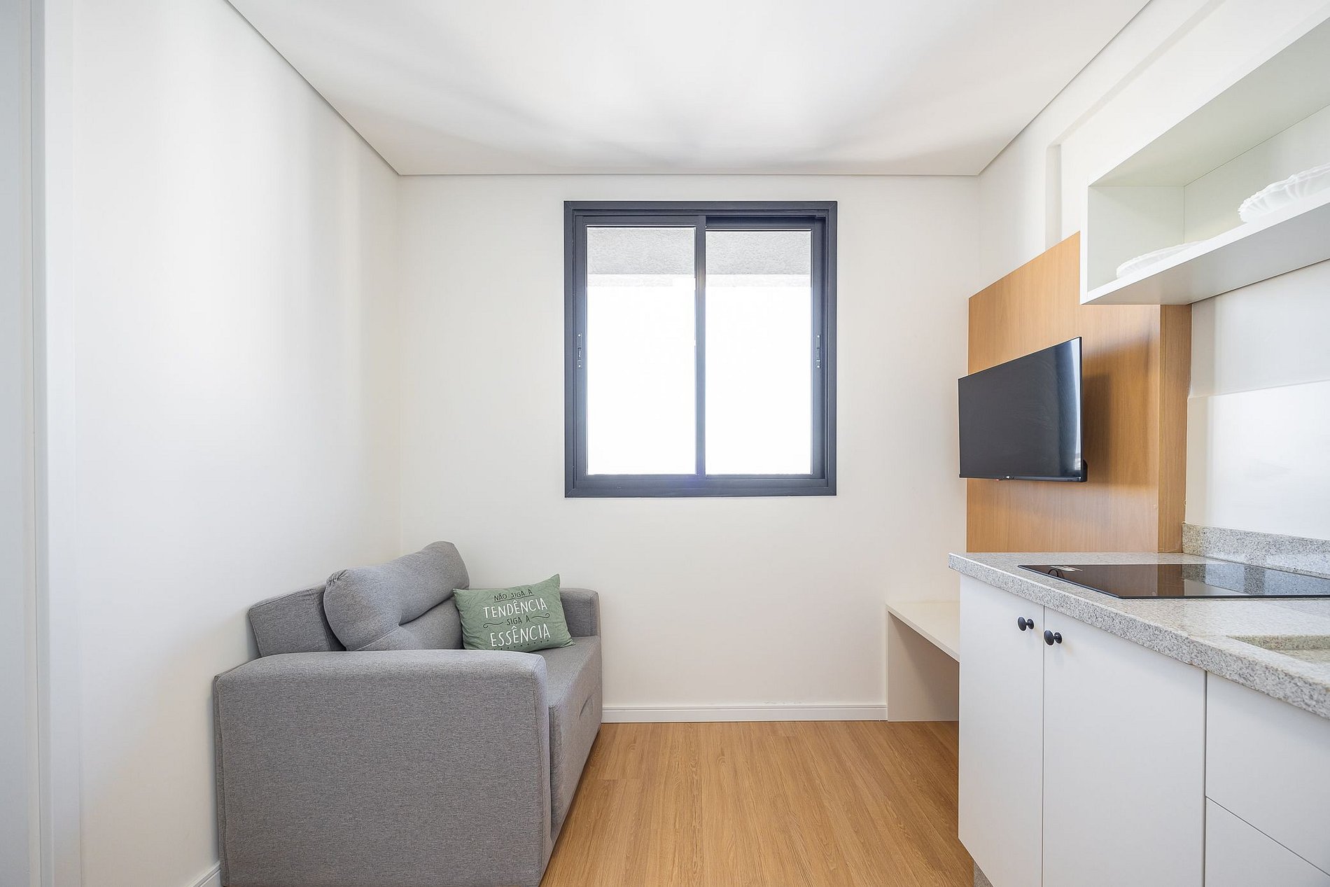 Studio totalmente mobiliado, no 4º andar, em excelente localização no centro de Curitiba/PR. Finamente decorado, com aproximadamente 30m², conta com: Wi-Fi incluído, Aquecimento elétrico, Móveis sob medida, Cama box casal, Smart TV, banquetas, frigobar, Fogão de elétrico de 2 bocas, microondas, Jogo de panelas, Talheres, Jogo de facas,Louças, Utensílios para cozinha. *Roupas de cama, mesa e banho não estão incluídas.
