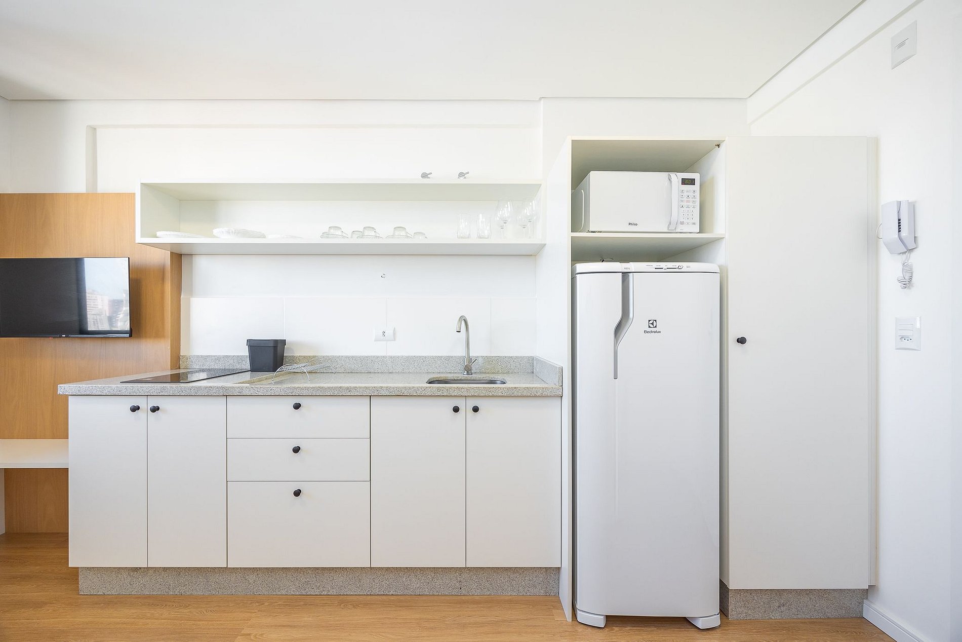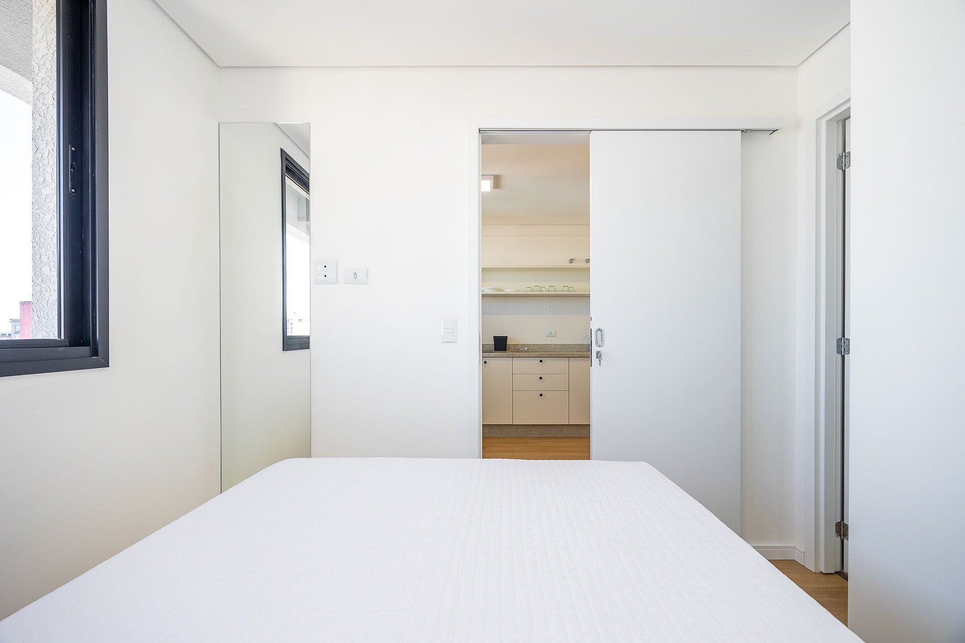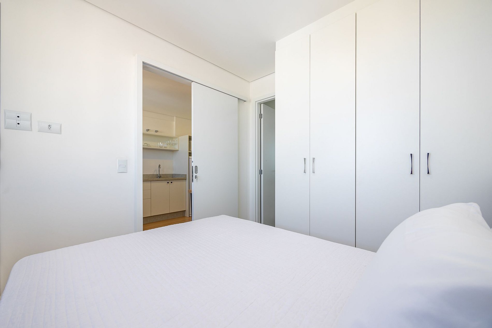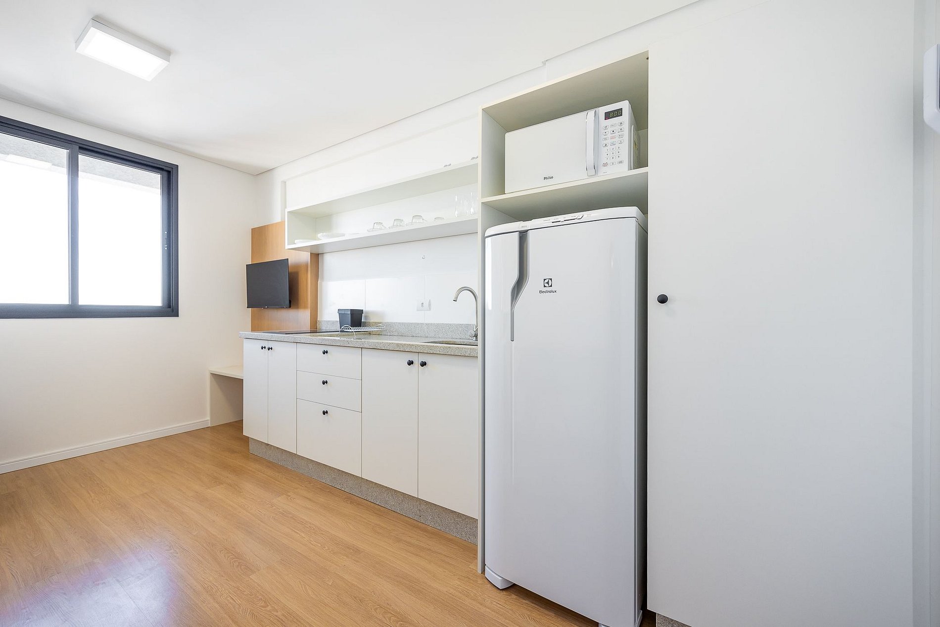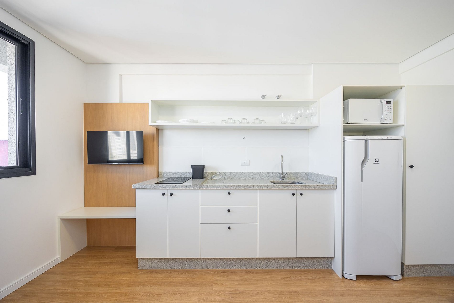 Studio totalmente mobiliado, no 4º andar, em excelente localização no centro de Curitiba/PR. Finamente decorado, com aproximadamente 30m², conta com: Wi-Fi incluído, Aquecimento elétrico, Móveis sob medida, Cama box casal, Smart TV, banquetas, frigobar, Fogão de elétrico de 2 bocas, microondas, Jogo de panelas, Talheres, Jogo de facas,Louças, Utensílios para cozinha. *Roupas de cama, mesa e banho não estão incluídas.