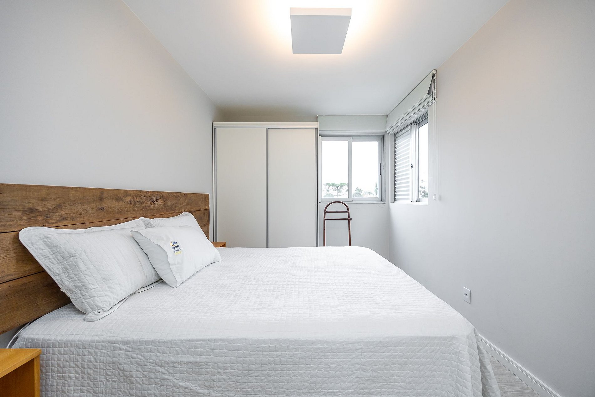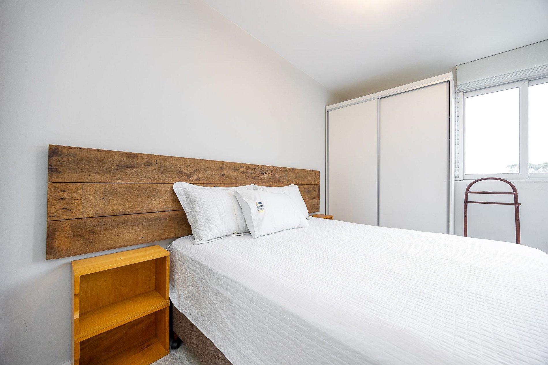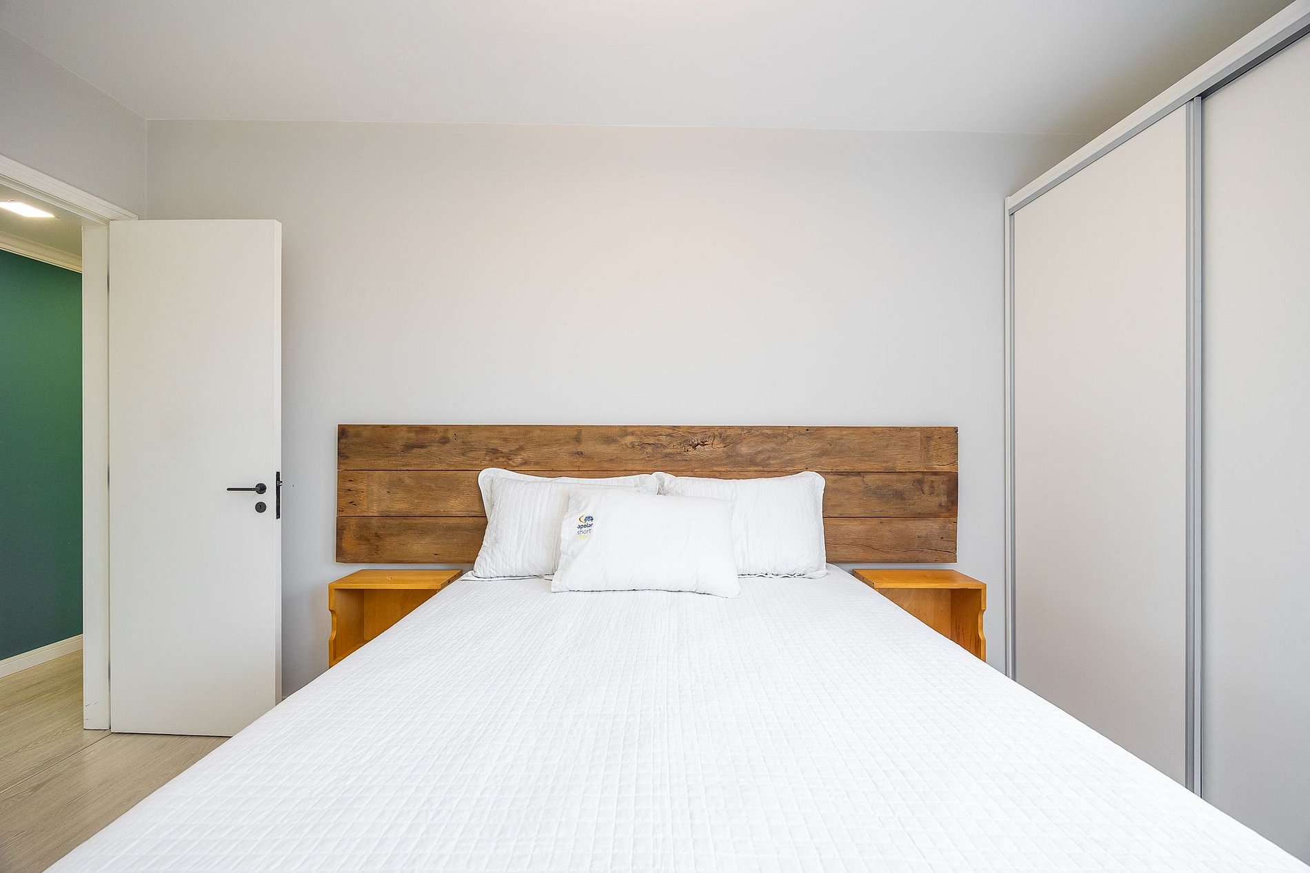 Suíte com cama de casal, roupeiro e mesa de cabeceira.