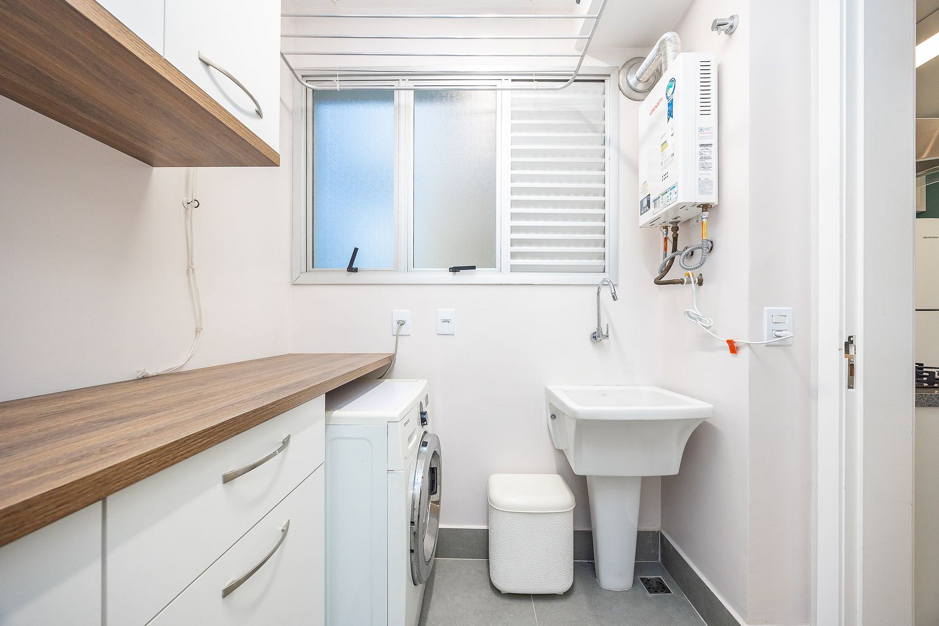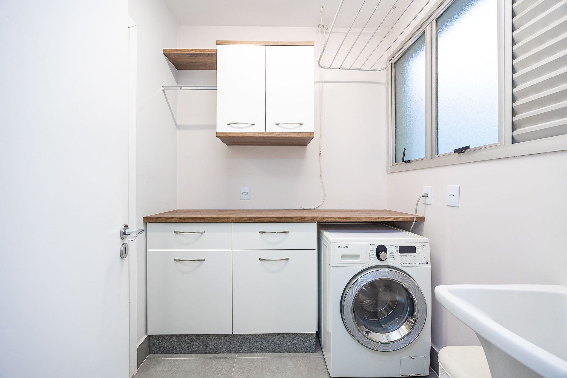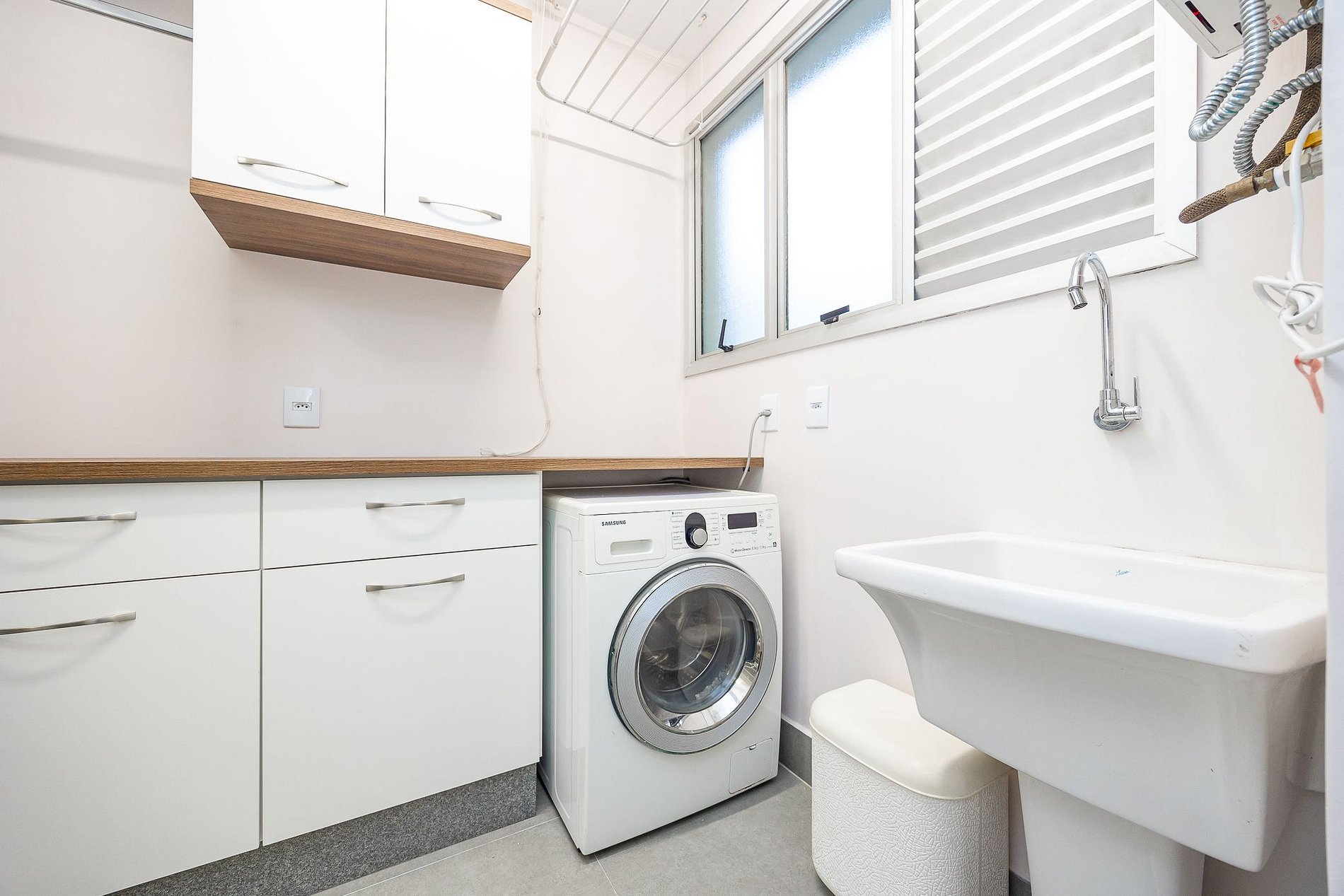 Lavanderia com maquina de lavar e secar Samsung e tanque.