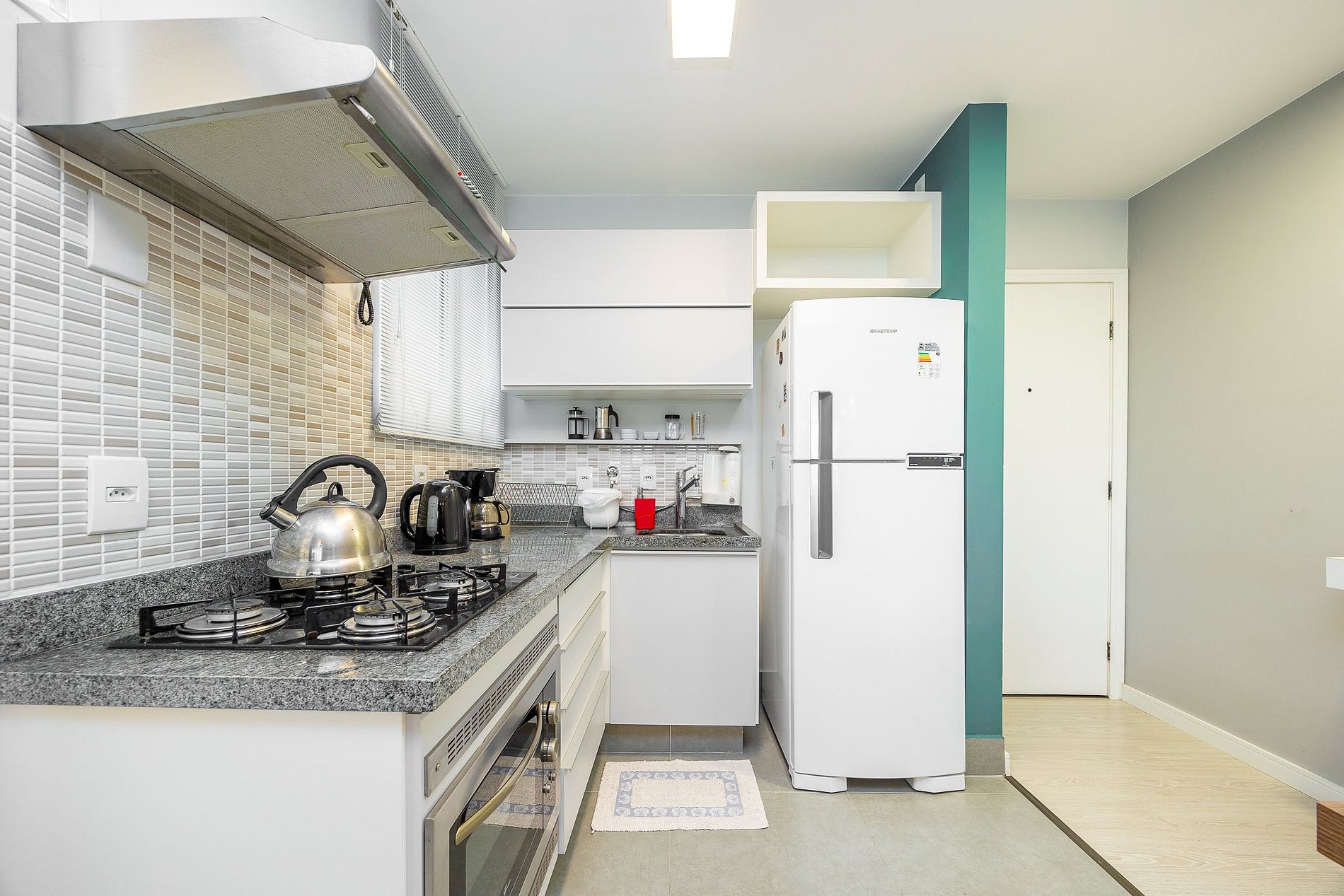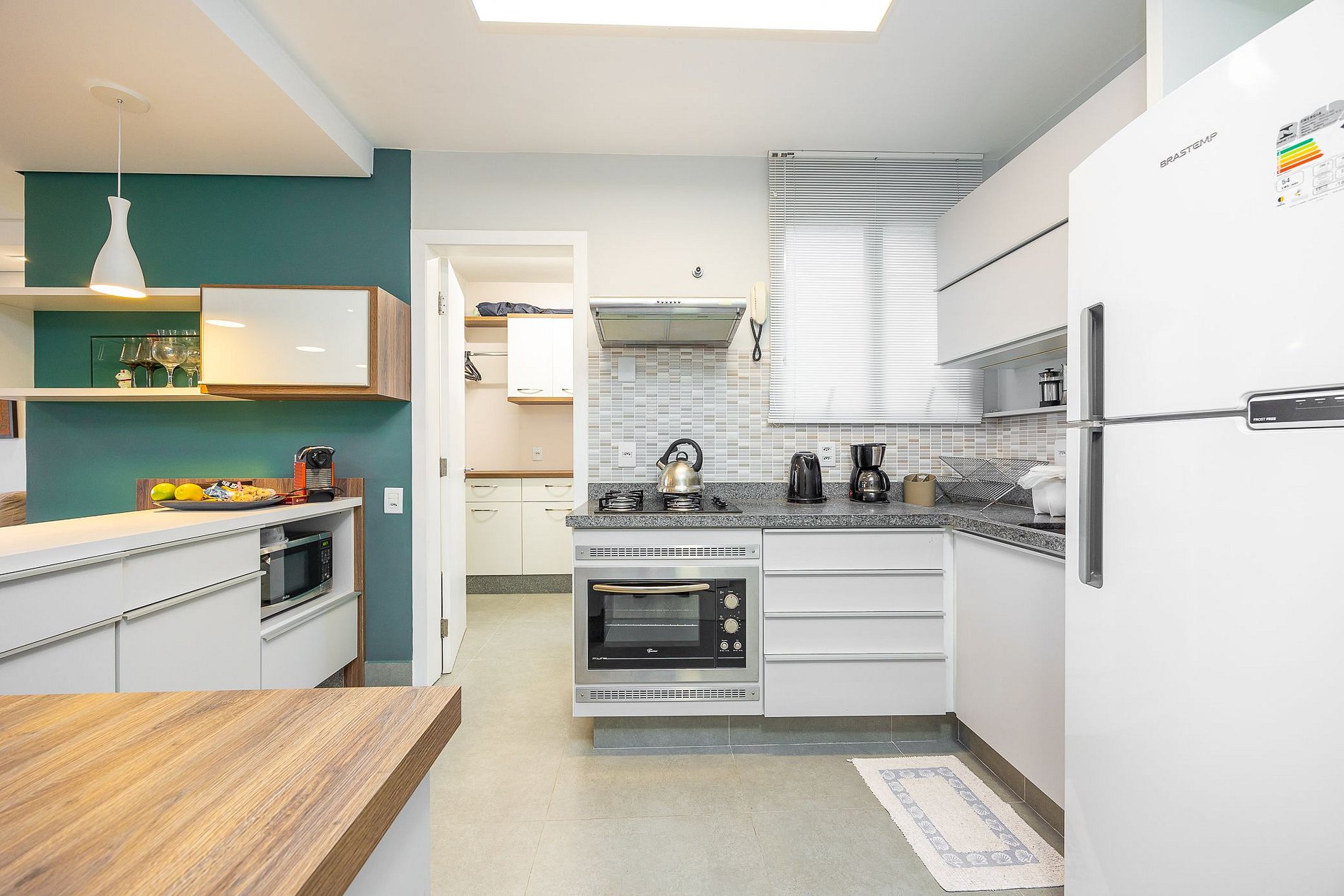 Cozinha completa, com geladeira duplex, fogão a gás, micro-ondas e todos os utensílios.
