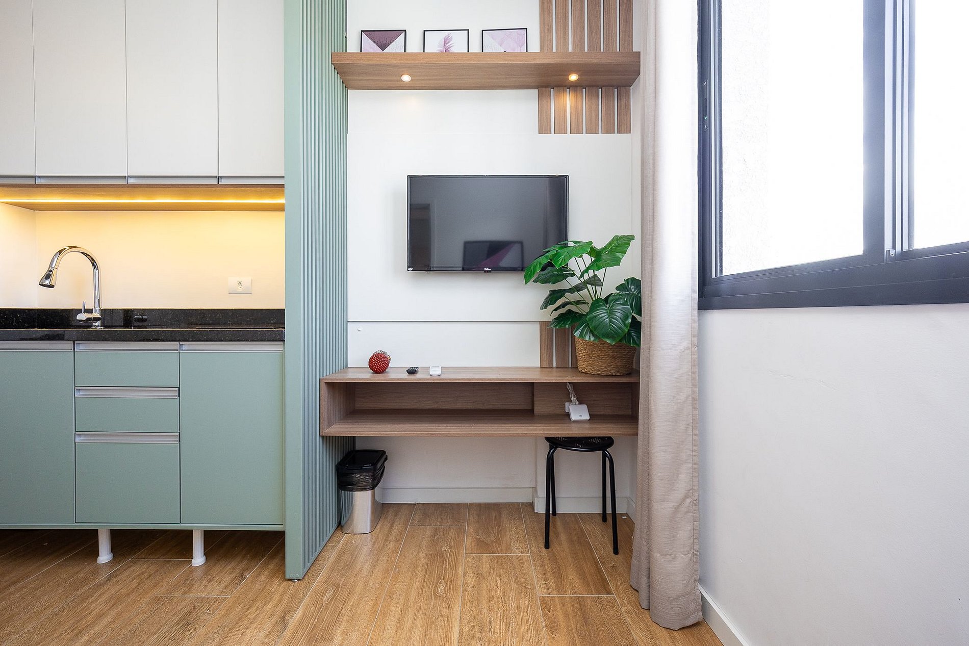 Wi-Fi incluído, Aquecimento a gás, Móveis sob medida, Cama box casal, Smart TV, Cadeiras, Geladeira, Fogão de indução, ,Jogo de panelas, Talheres, Jogo de facas, Louças, Utensílios para cozinha.