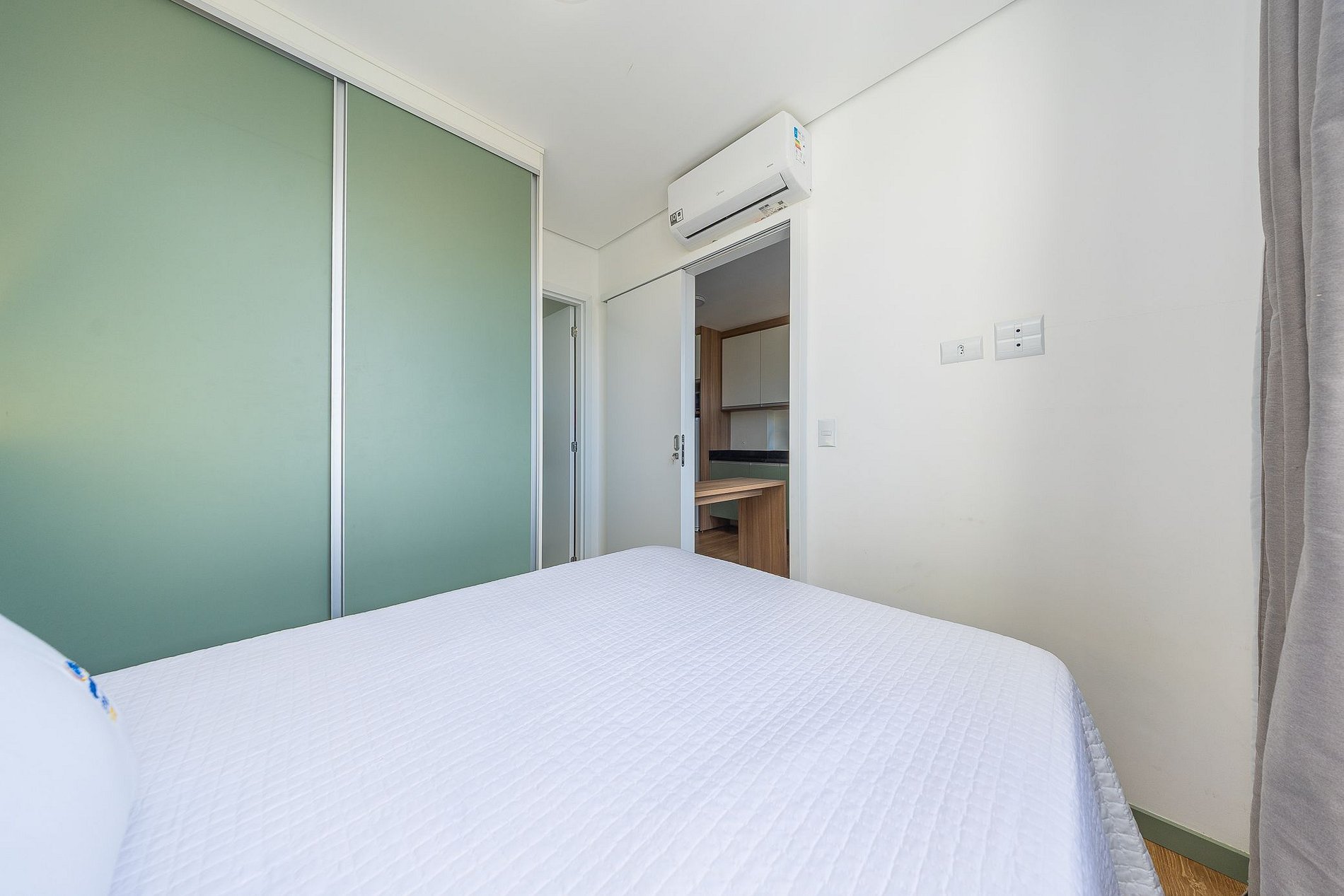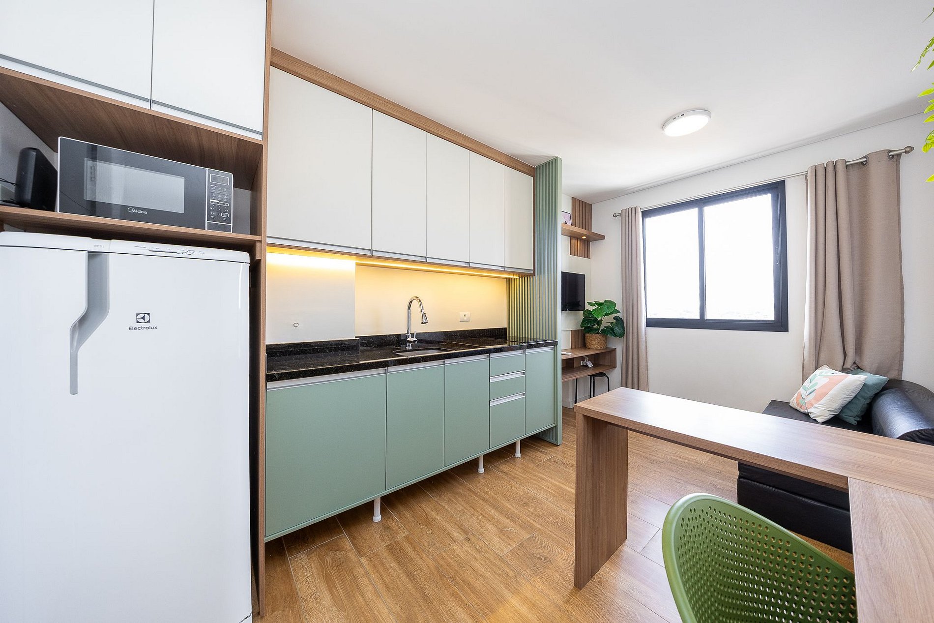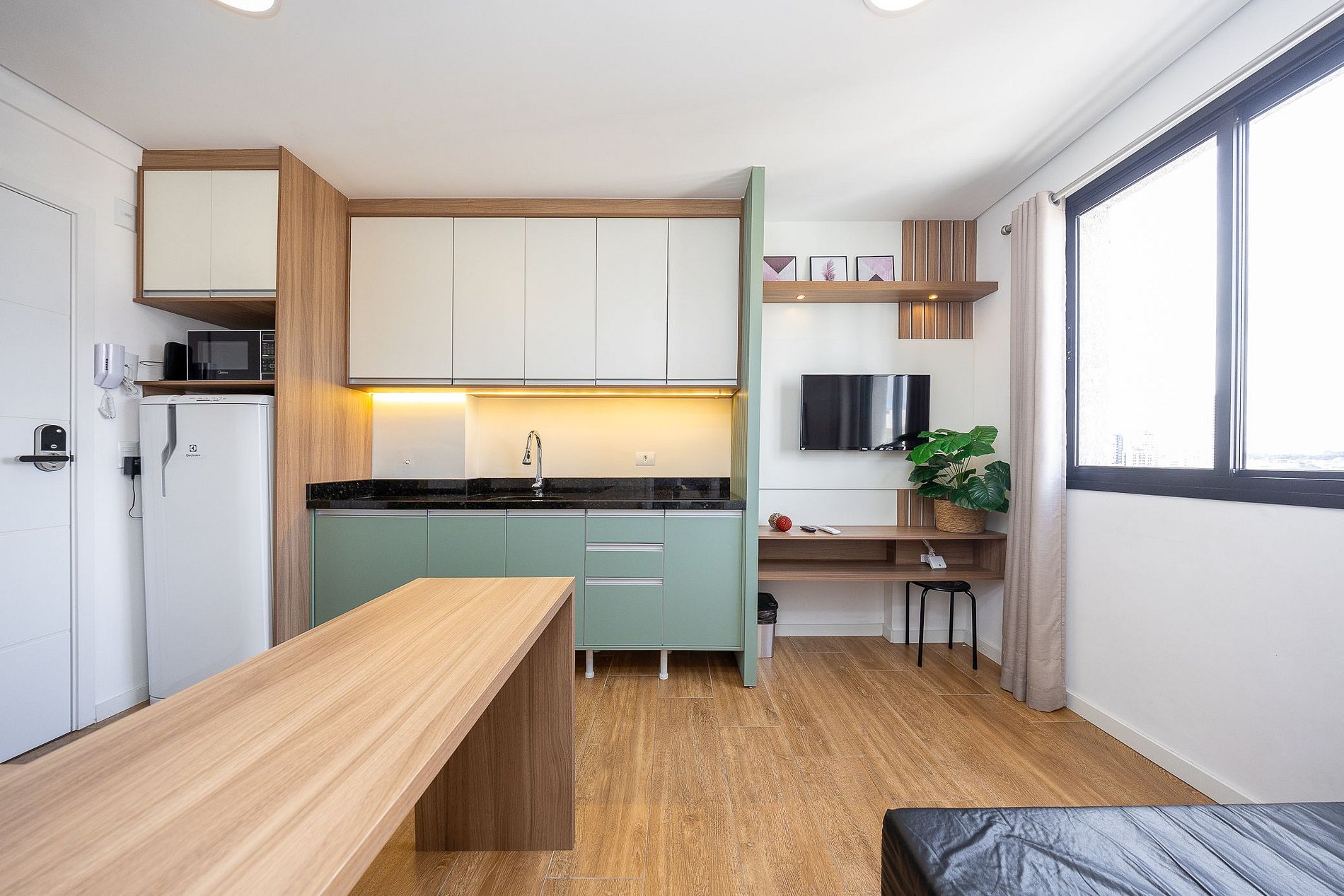 Studio totalmente mobiliado, no 14º andar, em excelente localização no centro de Curitiba/PR. Finamente decorado, com aproximadamente 29m², conta com: