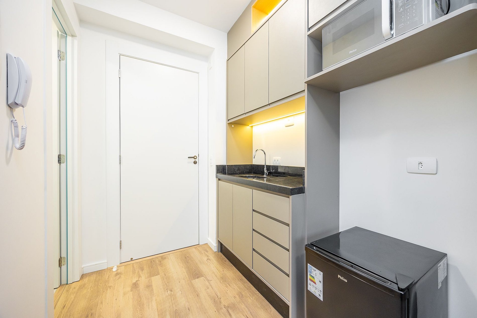 Wi-Fi incluído, Aquecimento central, Móveis sob medida, Cama box casal, Smart TV, frigobar, Fogão de indução de 2 bocas, micro-ondas, Jogo de panelas, Talheres, Jogo de facas, Louças, Utensílios para cozinha.