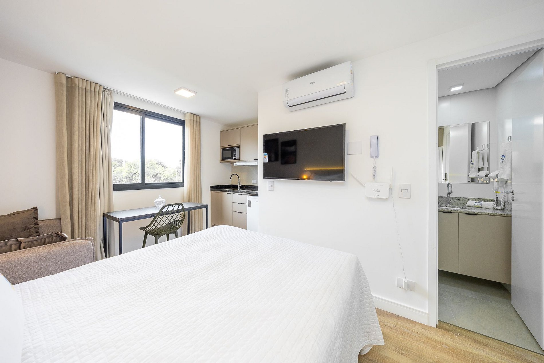 Sobre o apartamento: Studio totalmente mobiliado, no 3º andar, em excelente localização no Rebouças em Curitiba/PR. Finamente decorado, com aproximadamente 17m², conta com: Wi-Fi incluído, Aquecimento central, Móveis sob medida, Cama box casal, Smart TV, frigobar, Fogão de indução de 2 bocas, micro-ondas, Jogo de panelas, Talheres, Jogo de facas, Louças, Utensílios para cozinha. Região com facilidades e comodidades. *Roupas de cama, mesa e banho não estão incluídas. O que está incluído no pacote mensal*: Aluguel, condomínio, água, gás, internet e energia eléctrica. O pacote mensal é calculado com base no consumo médio dos meses anteriores e consumos muito elevados poderão gerar cobrança adicional.