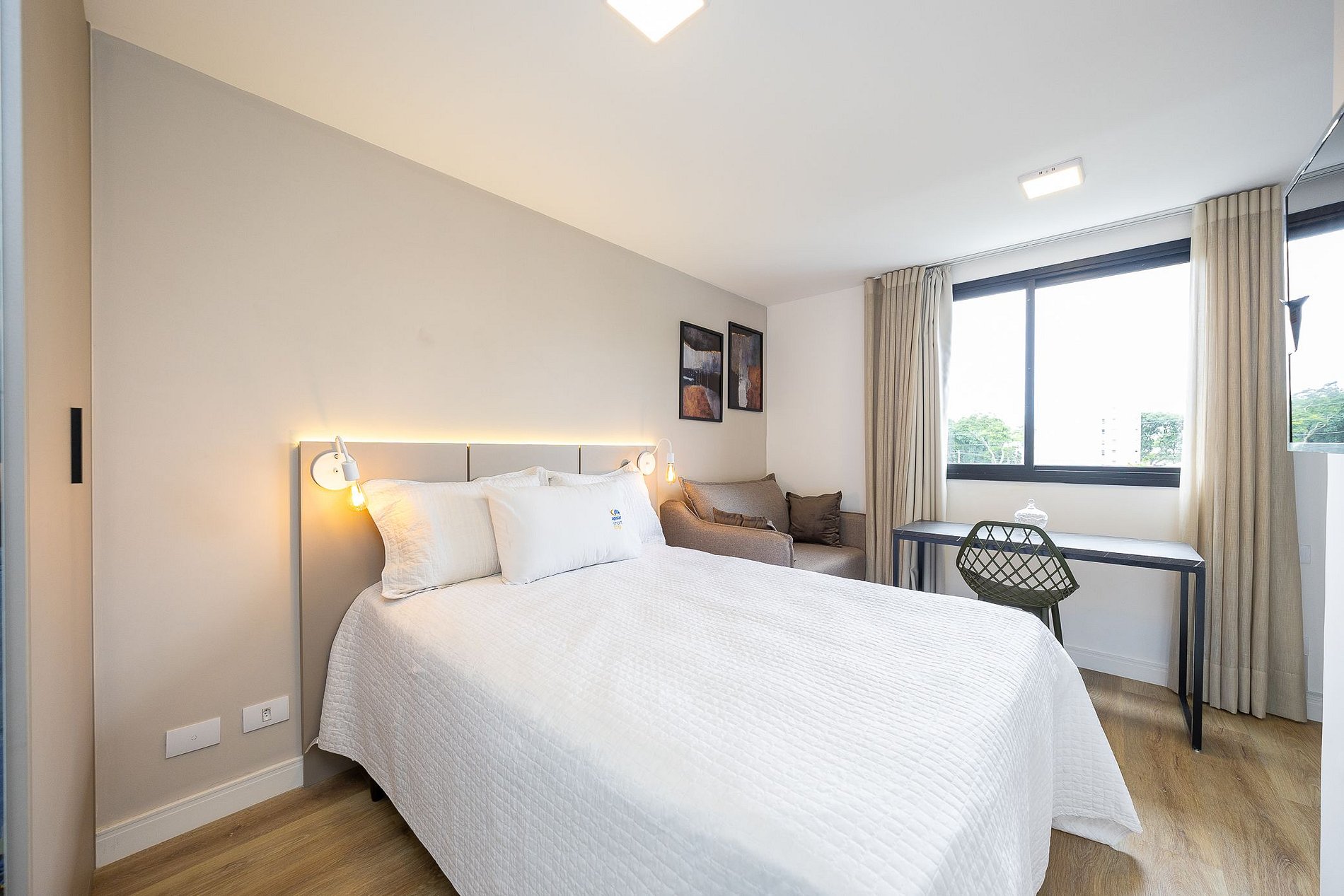 Sobre o apartamento: Studio totalmente mobiliado, no 3º andar, em excelente localização no Rebouças em Curitiba/PR. Finamente decorado, com aproximadamente 17m², conta com: Wi-Fi incluído, Aquecimento central, Móveis sob medida, Cama box casal, Smart TV, frigobar, Fogão de indução de 2 bocas, micro-ondas, Jogo de panelas, Talheres, Jogo de facas, Louças, Utensílios para cozinha. Região com facilidades e comodidades. *Roupas de cama, mesa e banho não estão incluídas. O que está incluído no pacote mensal*: Aluguel, condomínio, água, gás, internet e energia eléctrica. O pacote mensal é calculado com base no consumo médio dos meses anteriores e consumos muito elevados poderão gerar cobrança adicional.