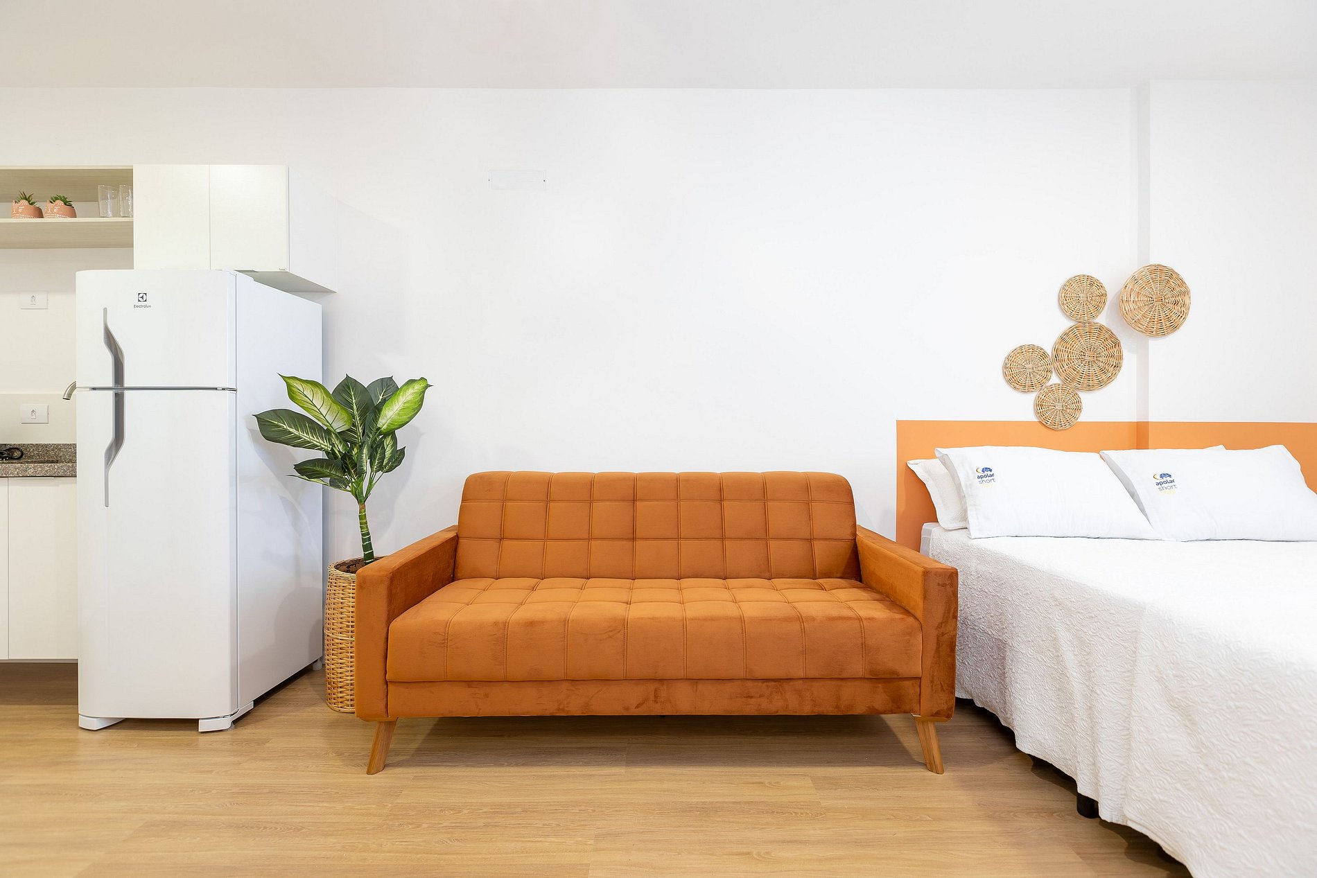 Wi-Fi, Aquecimento a gás, Móveis sob medida, Cama box casal, Smart TV 32", Cadeiras, Geladeira duplex, Fogão de indução, Chaleira elétrica, Sanduicheira/Grill, Panela elétrica, Jogo de panelas, Talheres, Jogo de facas, Abridor de vinho, Louças, Utensílios para cozinha, Ar Condicionado.
