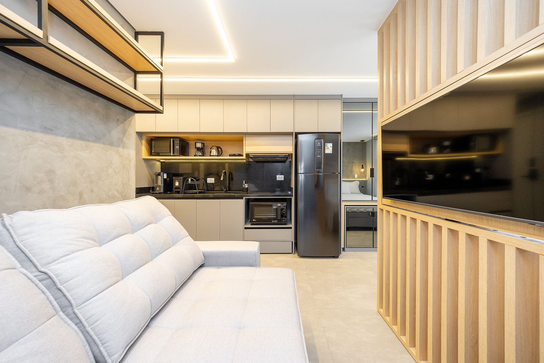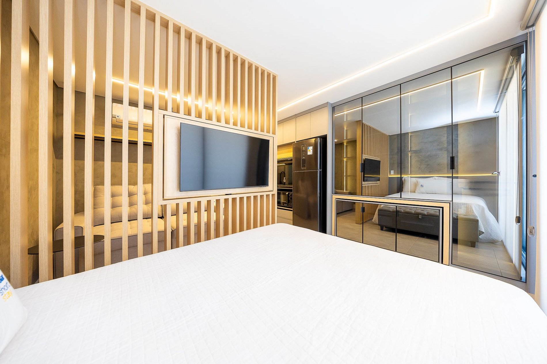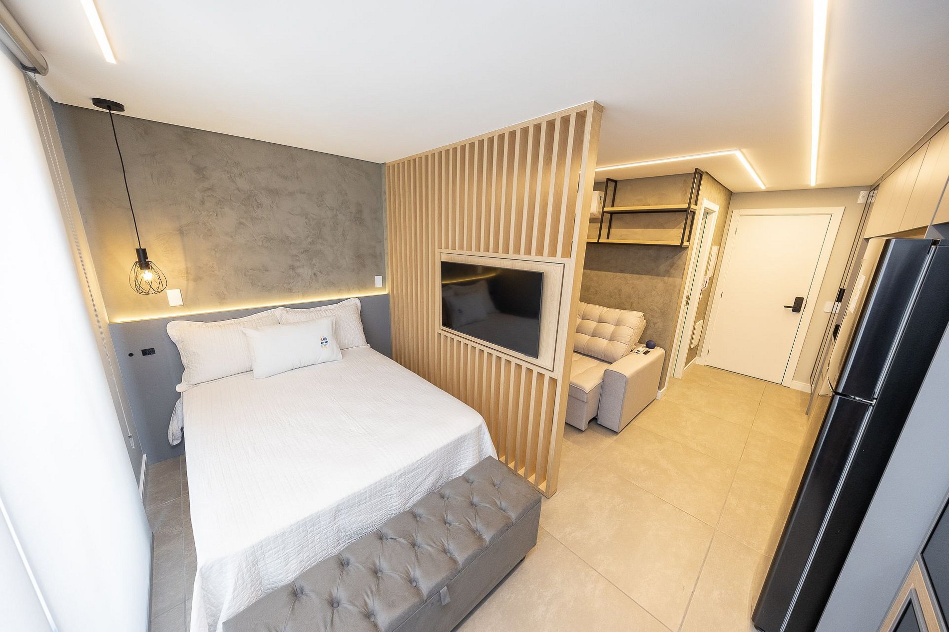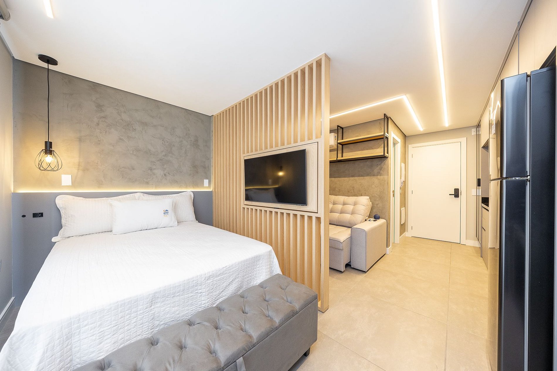 Wi-Fi incluído, Aquecimento a gás, Móveis sob medida, Cama box casal, Smart TV, Cadeiras, Geladeira, Fogão de indução de 2 bocas, Jogo de panelas, Talheres, Jogo de facas,Louças, Utensílios para cozinha, ar condicionado quente e frio.