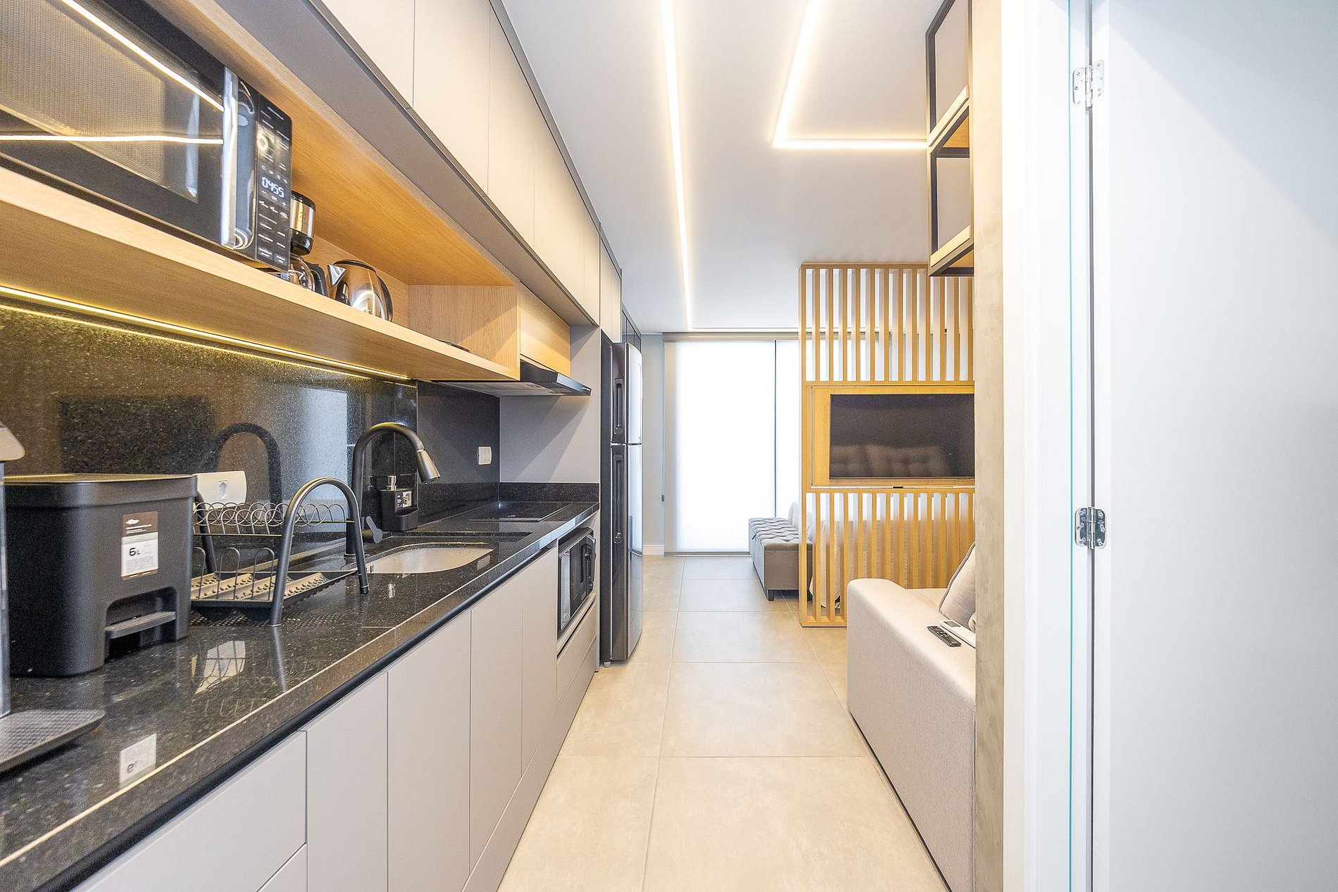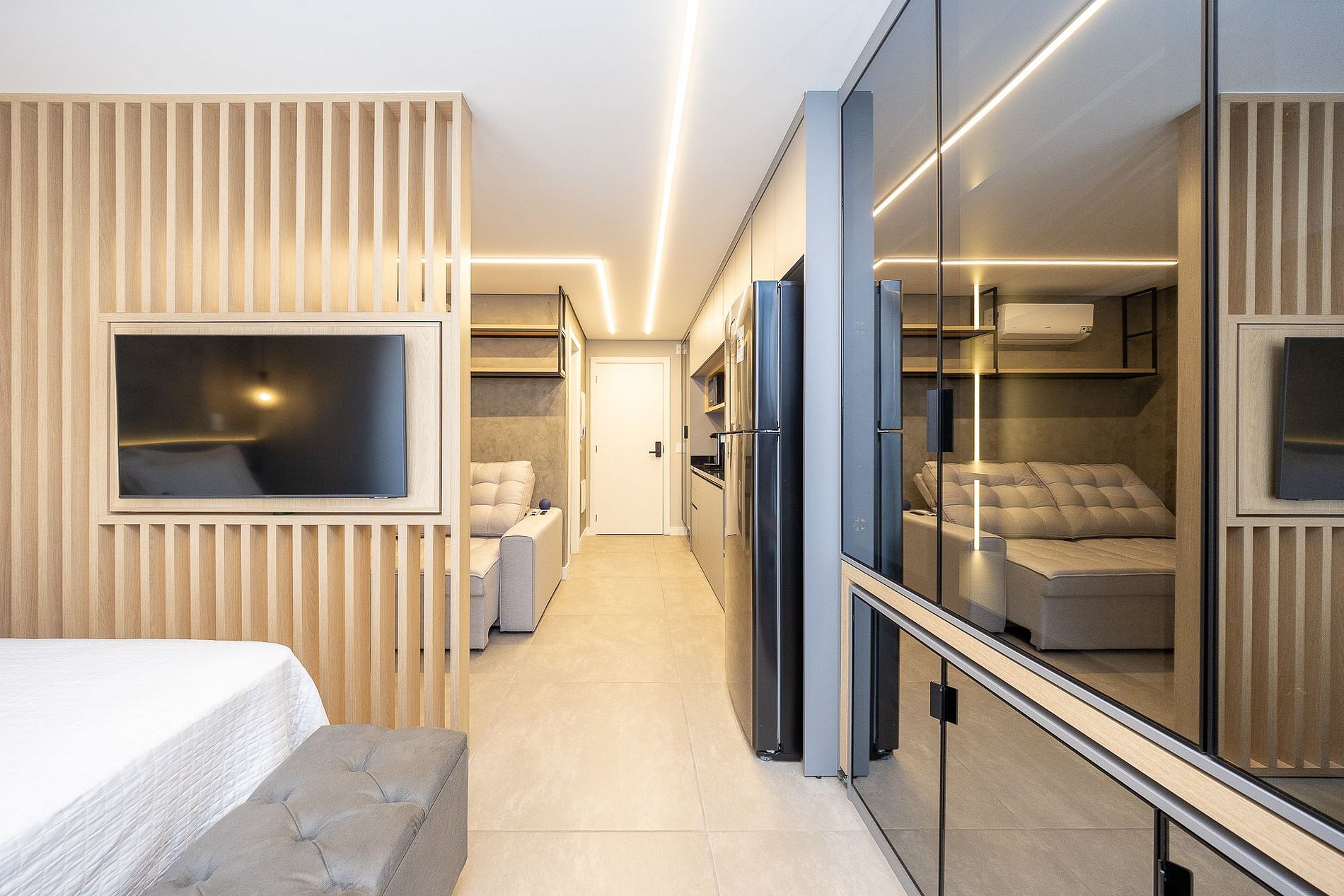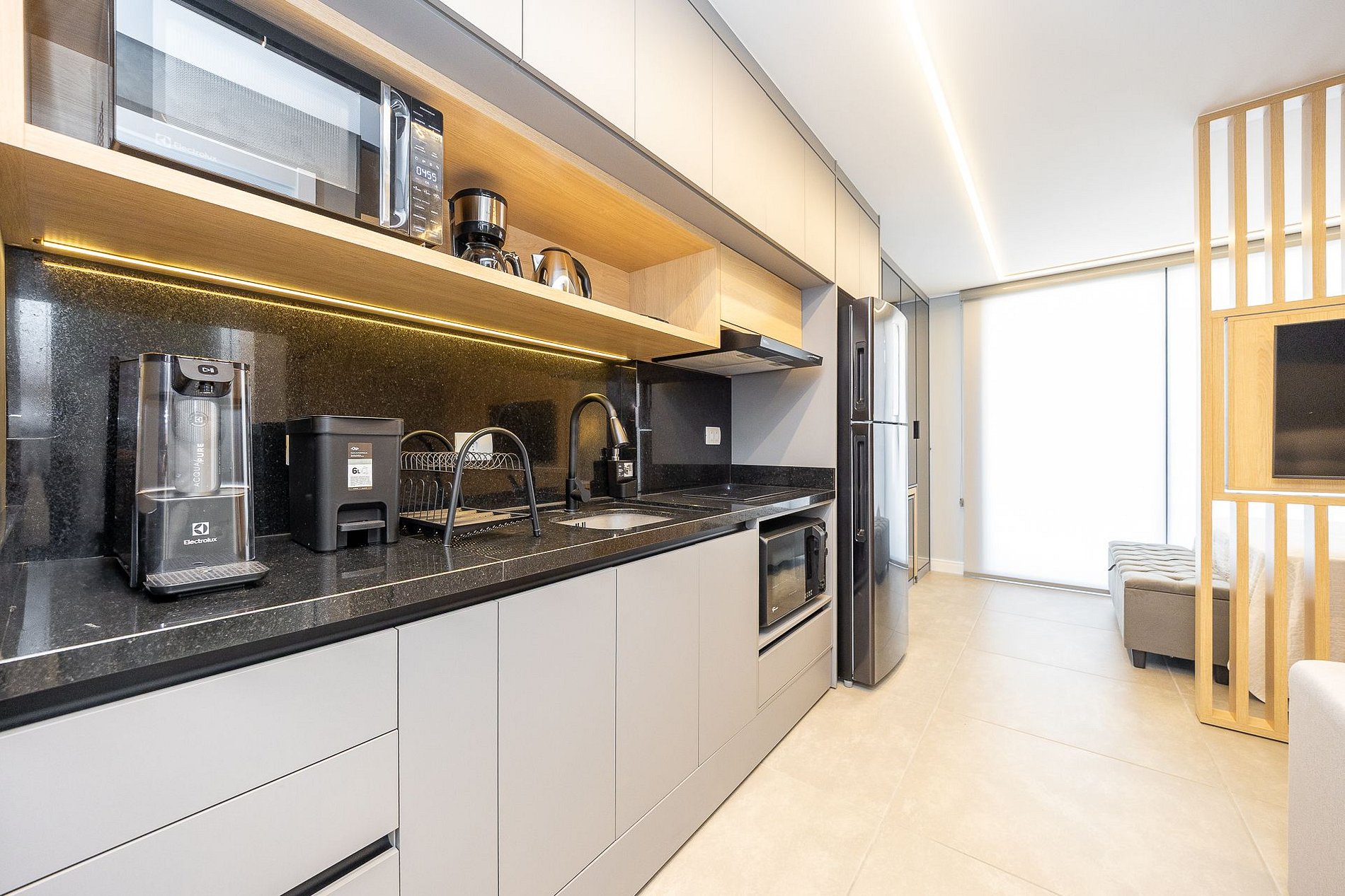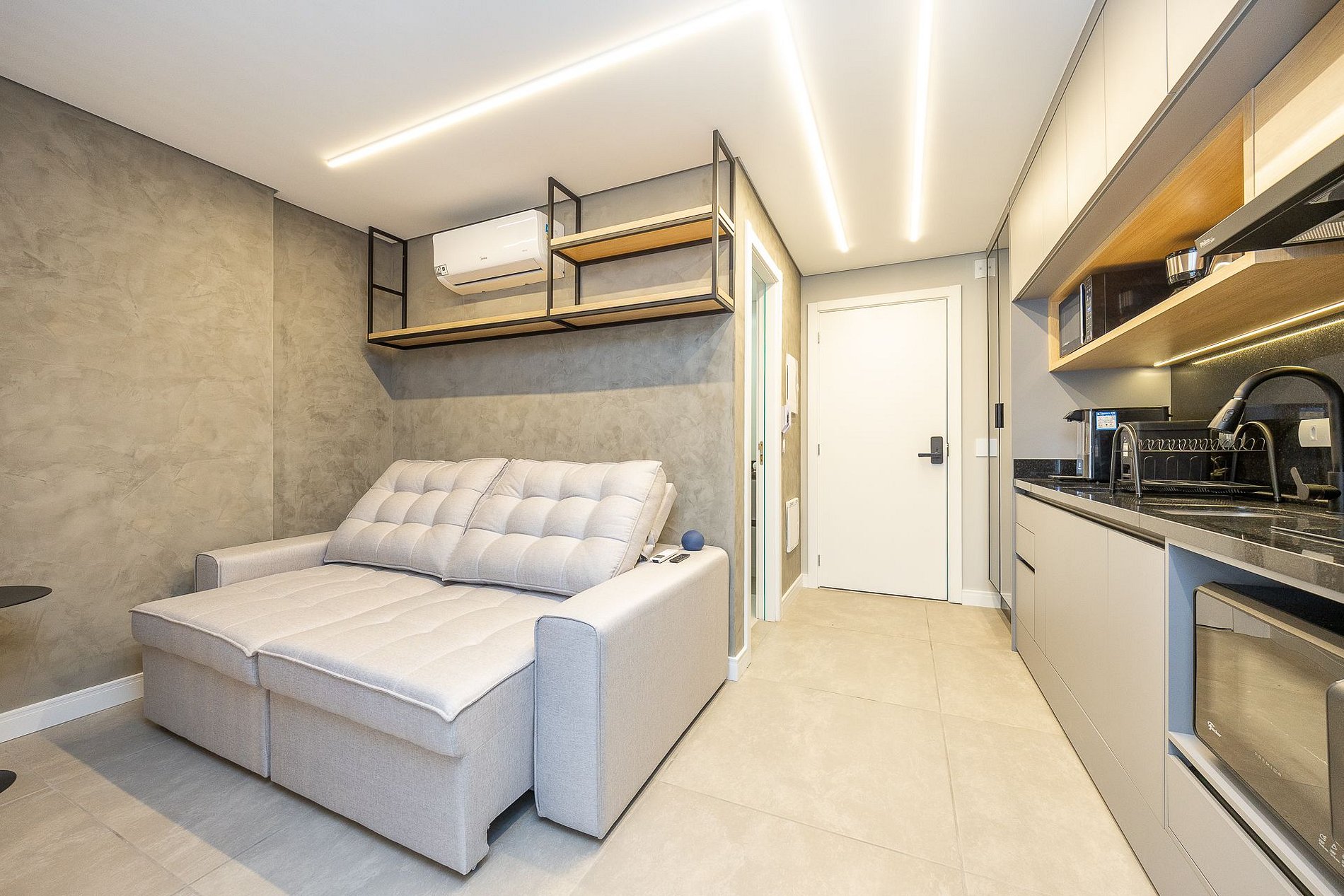 Wi-Fi incluído, Aquecimento a gás, Móveis sob medida, Cama box casal, Smart TV, Cadeiras, Geladeira, Fogão de indução de 2 bocas, Jogo de panelas, Talheres, Jogo de facas,Louças, Utensílios para cozinha, ar condicionado quente e frio.