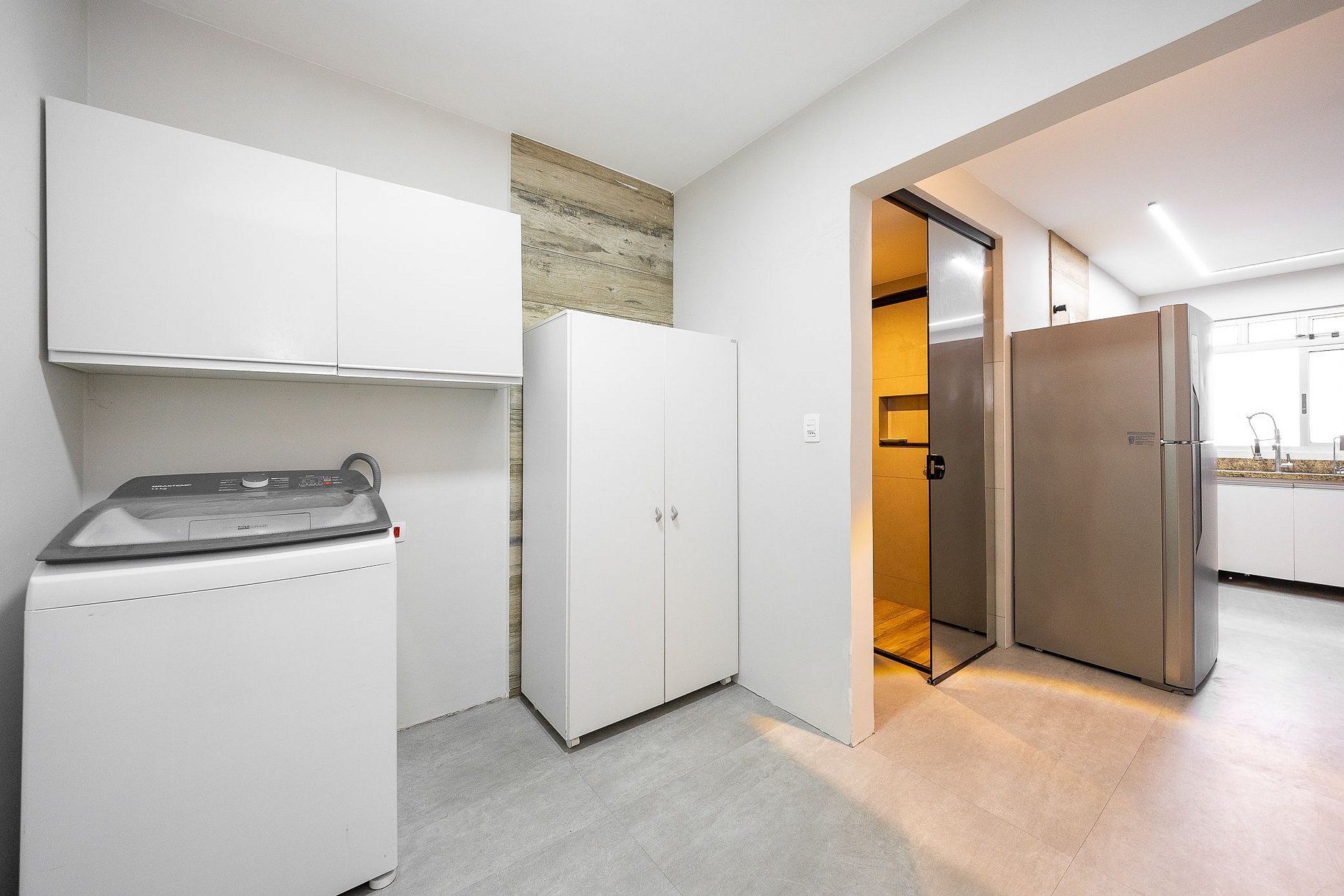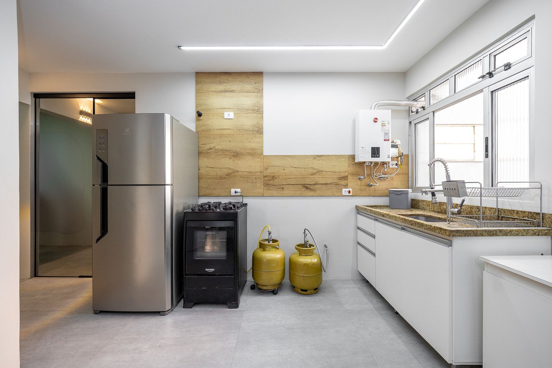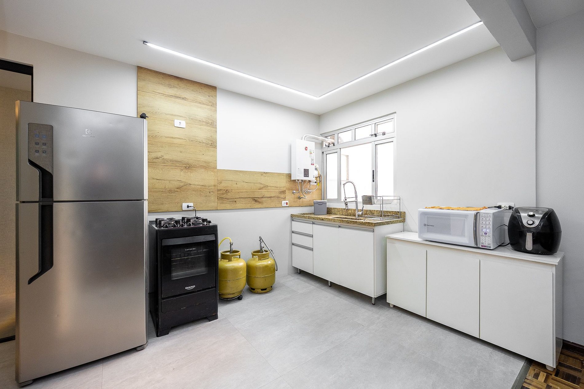 Cozinha completa, com geladeira, fogão a gás, micro-ondas e todos os utensílios.